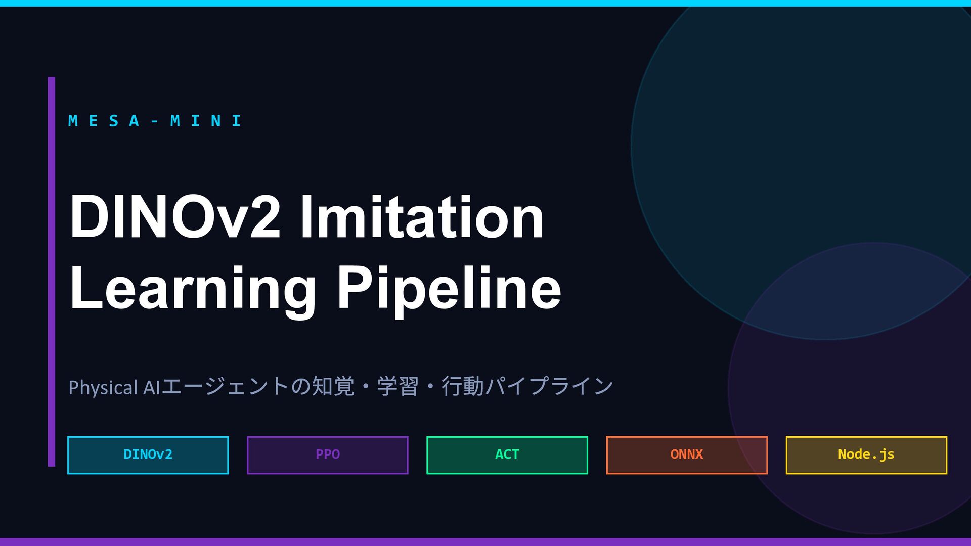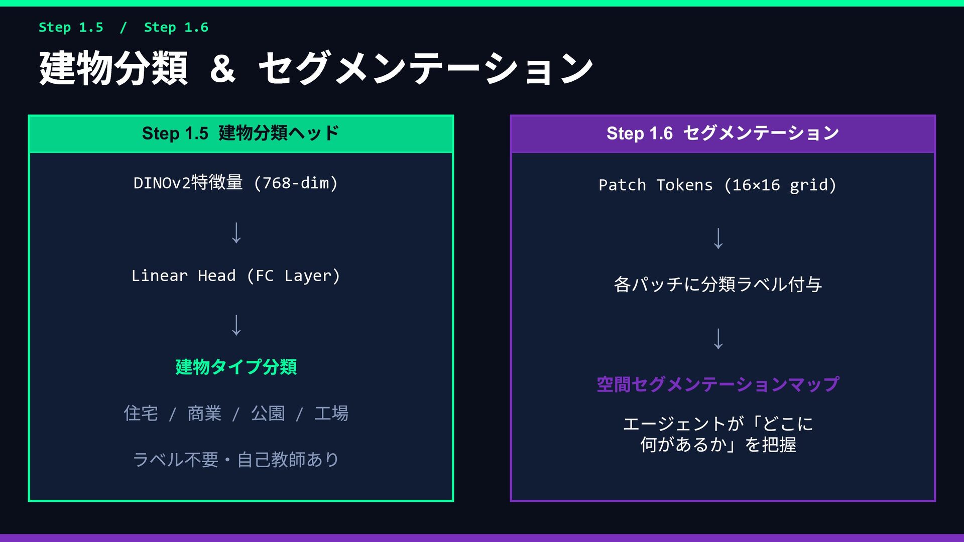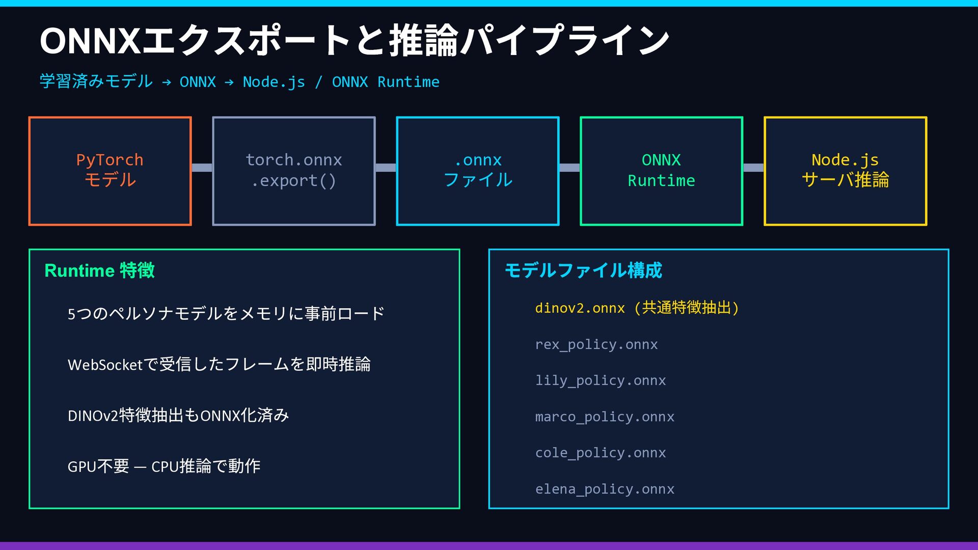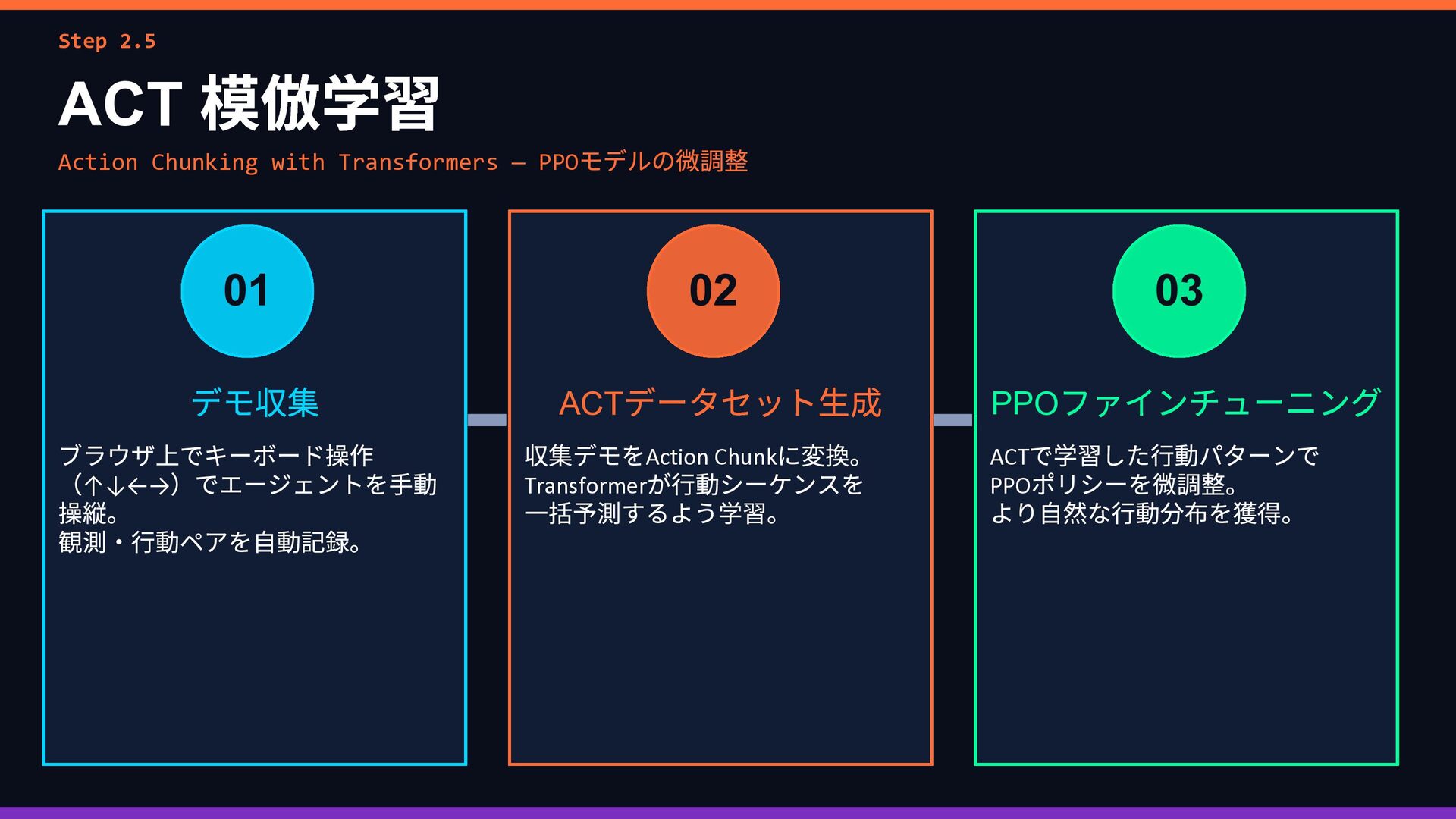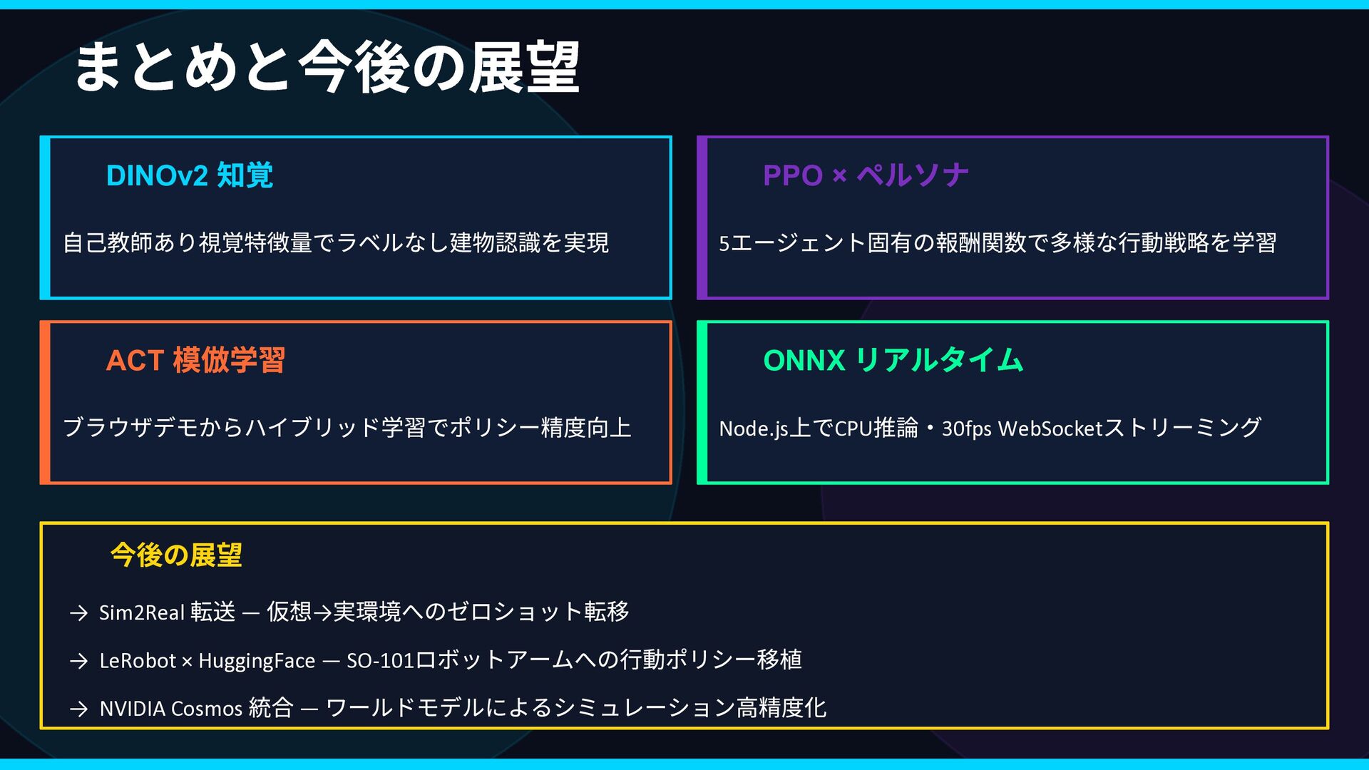 Rex Lily … 好奇心 ••••• •◦◦◦◦ 安定性 •◦◦◦◦ ••••• 社交性 ••◦◦◦ ••◦◦◦ 効率性 ••◦◦◦ •••◦◦ 観光性 •••◦◦ •◦◦◦◦ ↓ 報酬関数 R(s,a) に変換 → ② 並列 PPO 強化学習 同じ都市環境で5 エージェントが同時並列で独立学習 Rex Env(Sim) → R(s,a) → Policy 更新 Lily Env(Sim) → R(s,a) → Policy 更新 Marco Env(Sim) → R(s,a) → Policy 更新 Cole Env(Sim) → R(s,a) → Policy 更新 Elena Env(Sim) → R(s,a) → Policy 更新 ↓ 各ペルソナのポリシーが収束 → ③ ACT 模倣で検証 👤 人間がブラウザで エージェントを操作 📋 観測・行動ペアを デモとして収集 🔍 PPO の行動と 人間の行動を比較 ✅ 方向性が正しいか 確認・微調整 🔄 ズレがあれば PPO を再学習 性格の重みベクトル → 報酬関数 → 5 並列PPO 学習 → ACT 模倣で「人間の感覚」と照合 → ズレを修正してポリシー完成