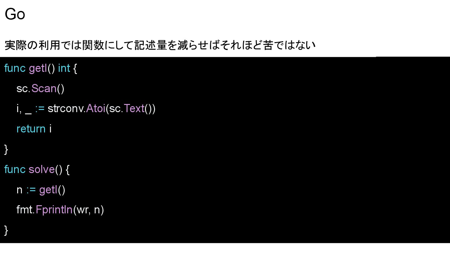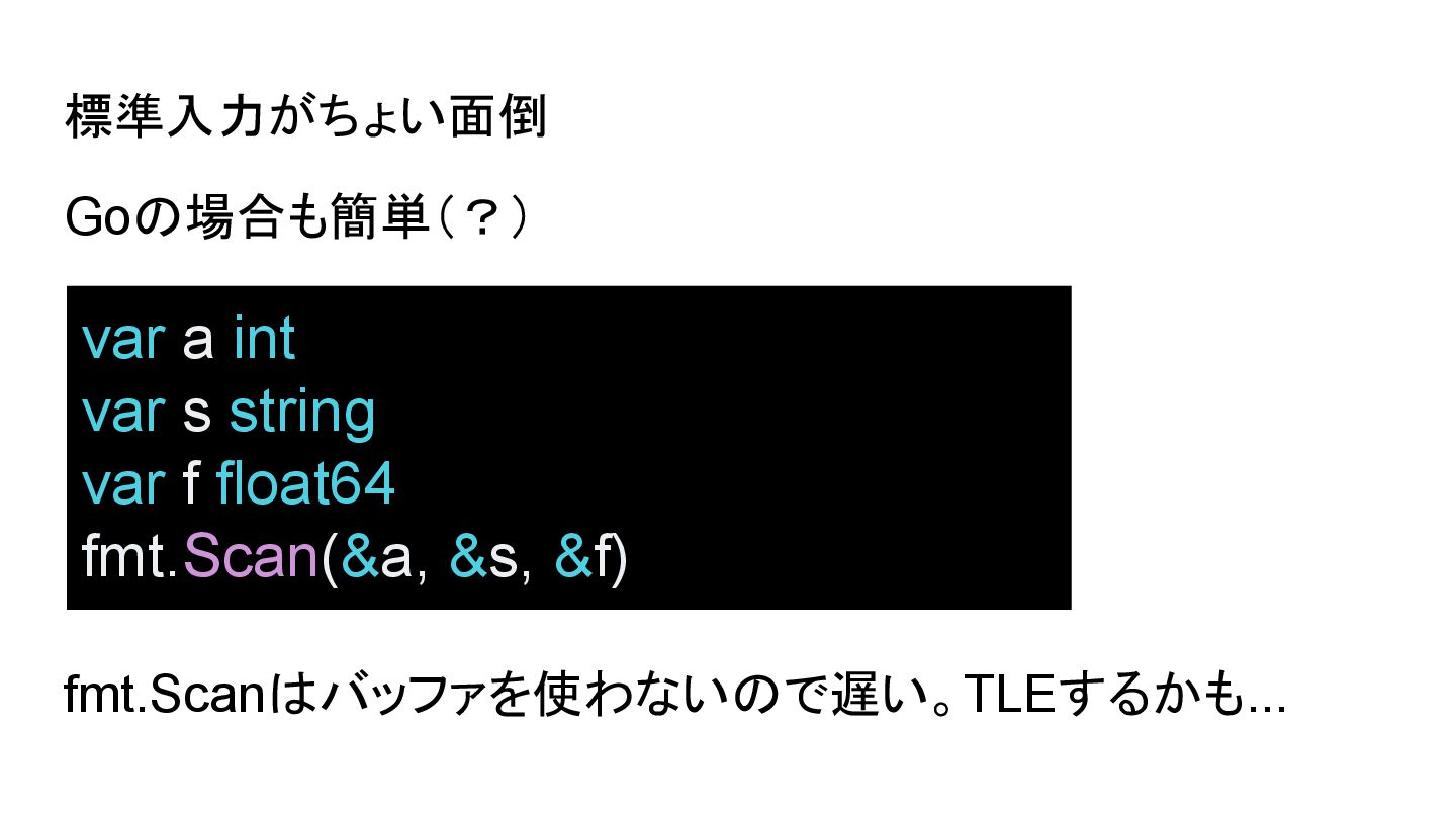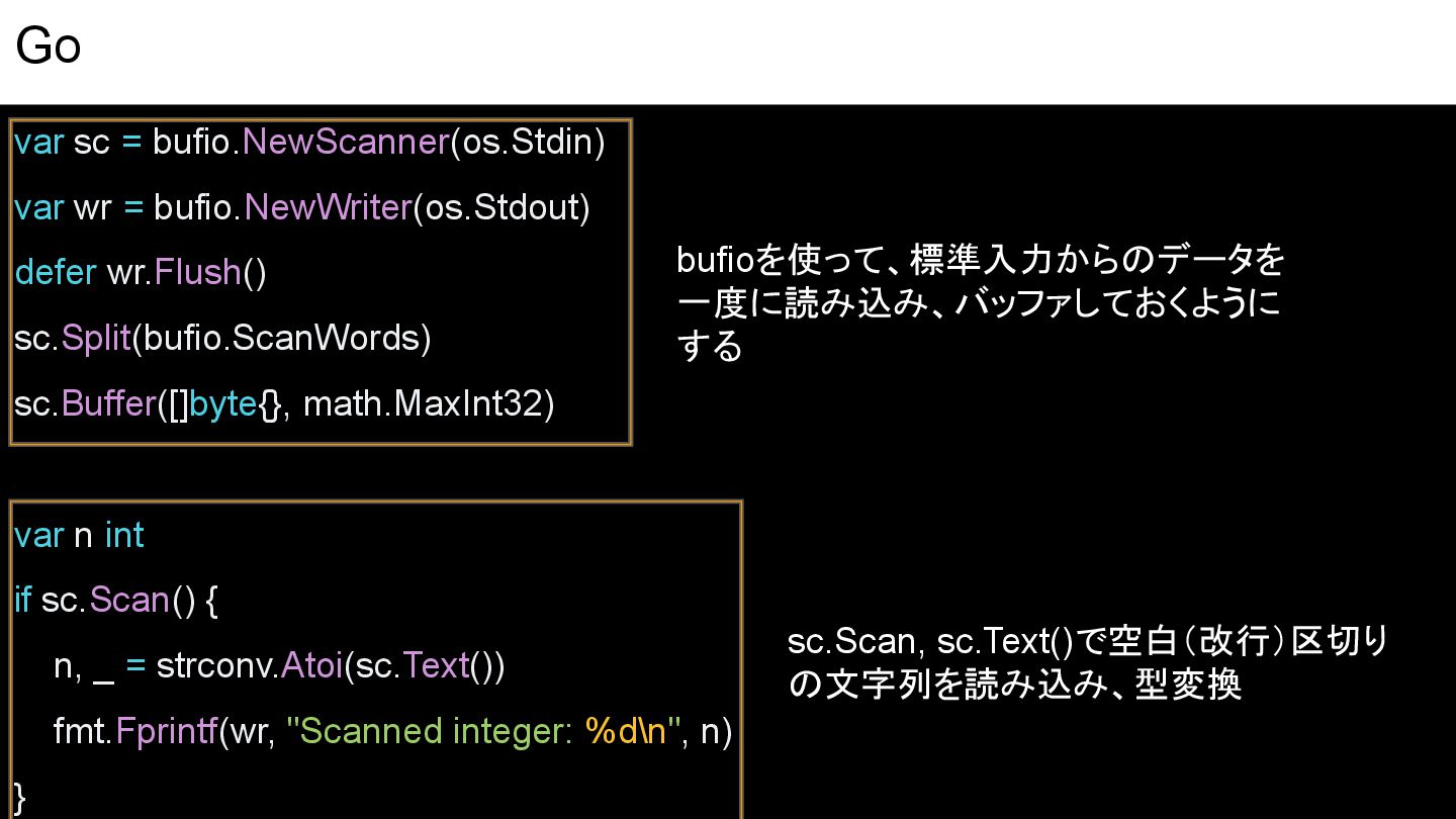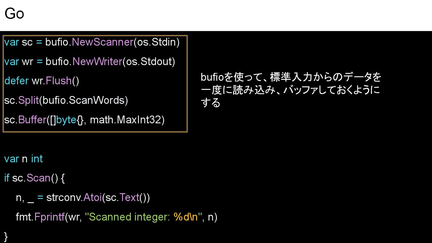 defer wr.Flush() sc.Split(bufio.ScanWords) sc.Buffer([]byte{}, math.MaxInt32) var n int if sc.Scan() { n, _ = strconv.Atoi(sc.Text()) fmt.Fprintf(wr, "Scanned integer: %d\n", n) } bufioを使って、標準入力からのデータを 一度に読み込み、バッファしておくように する