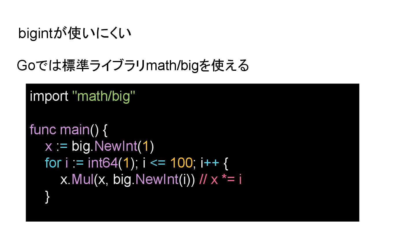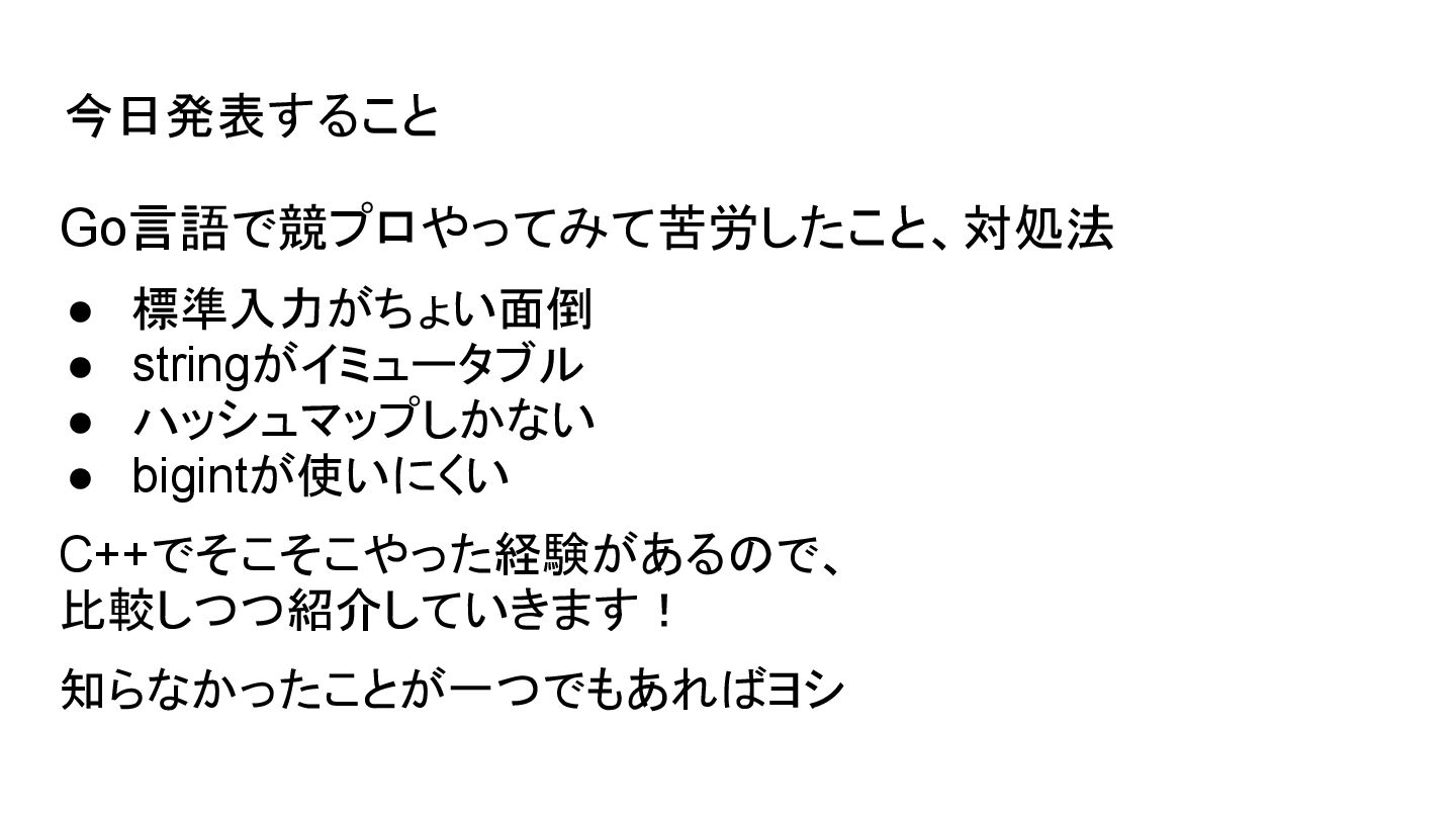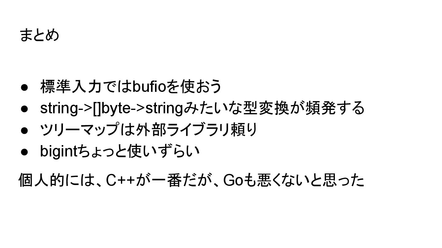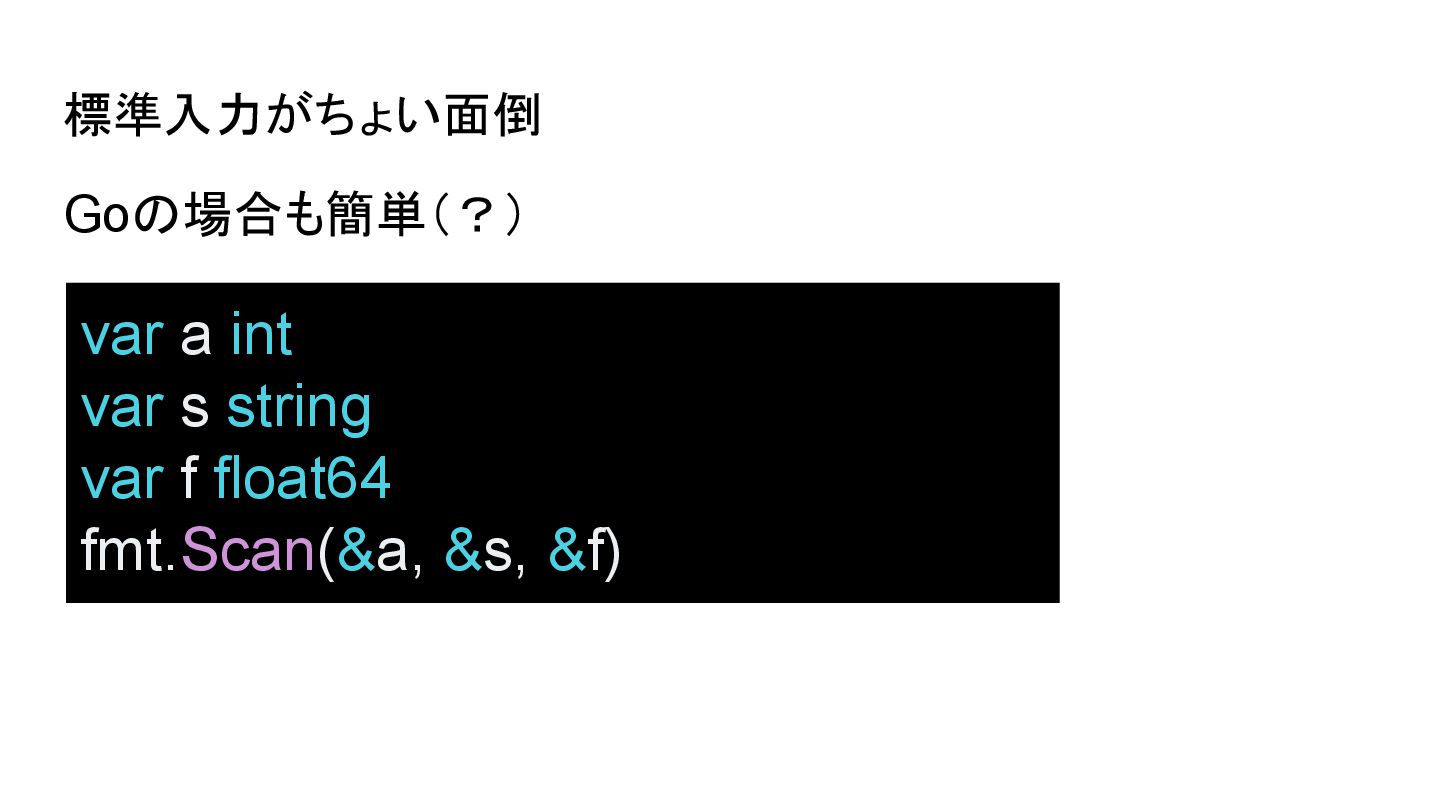 defer wr.Flush() sc.Split(bufio.ScanWords) sc.Buffer([]byte{}, math.MaxInt32) var n int if sc.Scan() { n, _ = strconv.Atoi(sc.Text()) fmt.Fprintf(wr, "Scanned integer: %d\n", n) } bufioを使って、標準入力からのデータを 一度に読み込み、バッファしておくように する