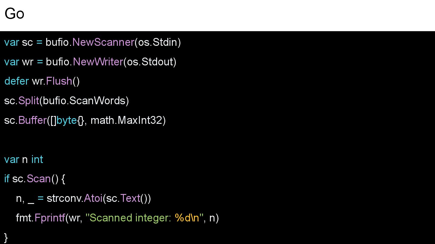 defer wr.Flush() sc.Split(bufio.ScanWords) sc.Buffer([]byte{}, math.MaxInt32) var n int if sc.Scan() { n, _ = strconv.Atoi(sc.Text()) fmt.Fprintf(wr, "Scanned integer: %d\n", n) }