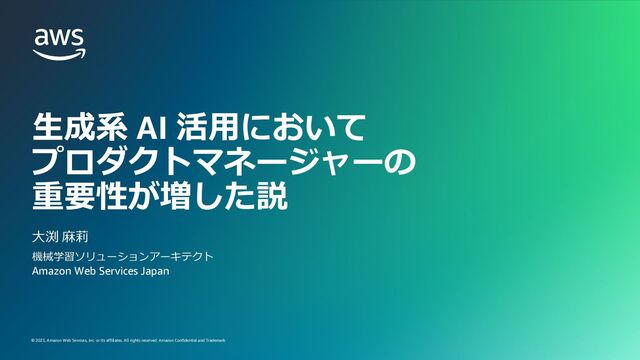rights reserved. Amazon Confidential and Trademark. プロダクトマネジャの重要性が増した、のココロ 20 ⽣成系 AI の登場で、プロダクトマネジャが⾃分できる範囲が格段に広くなった l PoC のためにソースコードを書く必要がないのでやる気があればできる︕ l プロダクトとユーザに精通しているプロダクトマネジャだからできることがある︕ PoC の結果をベースにエンジニアと具体的な議論が可能になる l 叩き台があるとめちゃくちゃ議論しやすい︕ l プロダクトマネジャが何を⽬指しているのかがエンジニアにも理解できる︕ プロダクトマネジャが最新技術を直接使える時代に