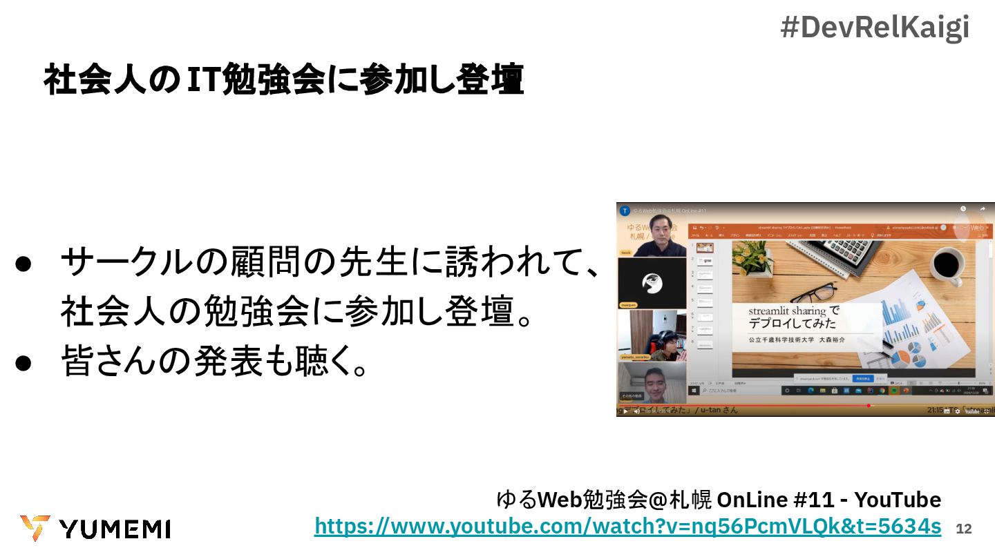 #DevRelKaigi 社会人のIT勉強会に参加し登壇 • サークルの顧問の先生に誘われて、 社会人の勉強会に参加し登壇。 • 皆さんの発表も聴く。 12 ゆるWeb勉強会@札幌