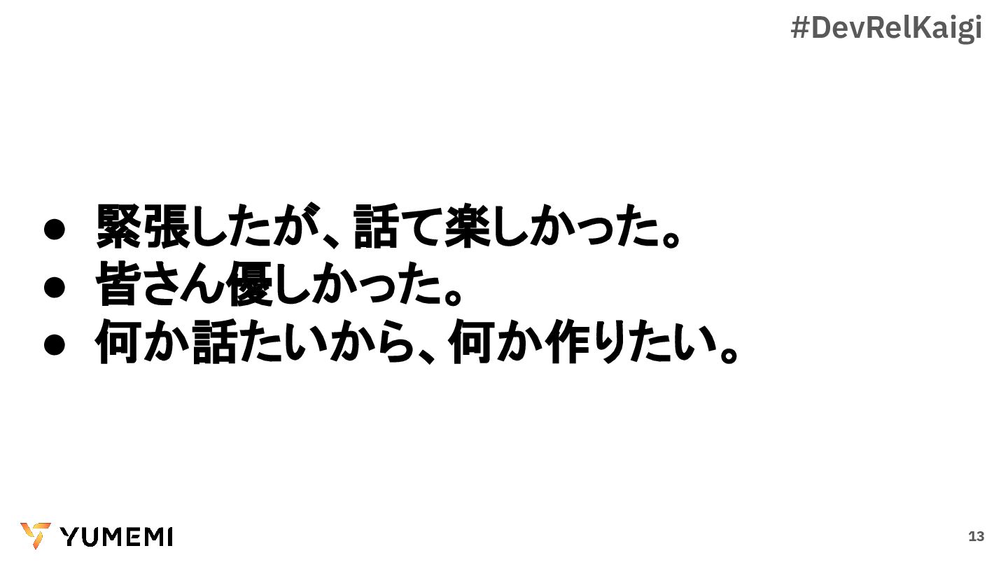 #DevRelKaigi • 緊張したが、話て楽しかった。 • 皆さん優しかった。 • 何か話たいから、何か作りたい。