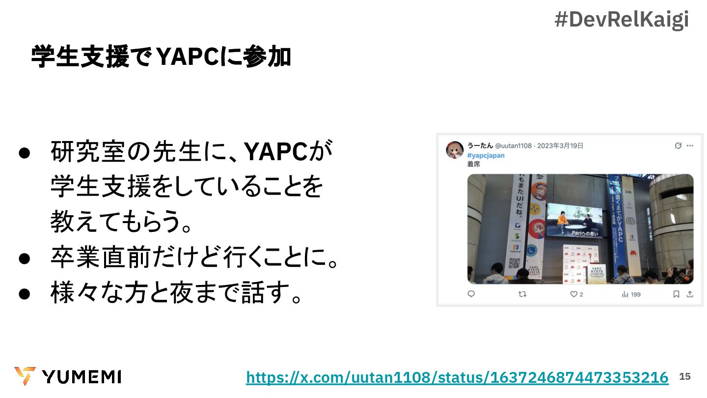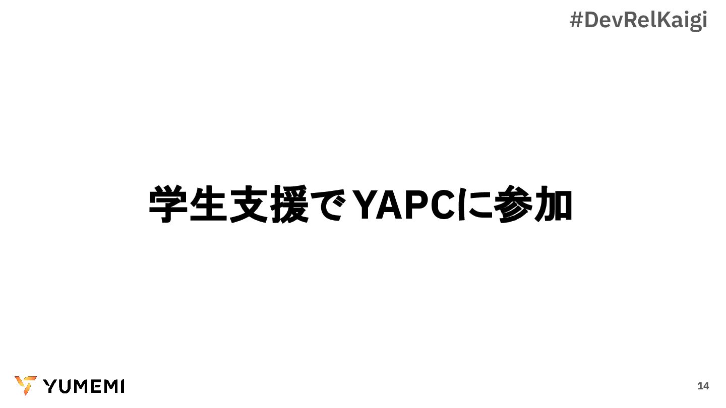 #DevRelKaigi 学生支援で YAPCに参加 • 研究室の先生に、YAPCが 学生支援をしていることを 教えてもらう。 • 卒業直前だけど行くことに。 •