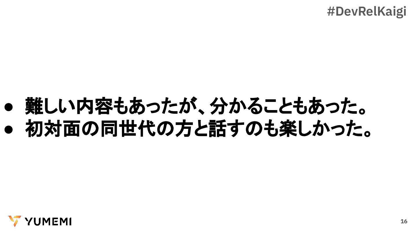#DevRelKaigi • 難しい内容もあったが、分かることもあった。 • 初対面の同世代の方と話すのも楽しかった。 16