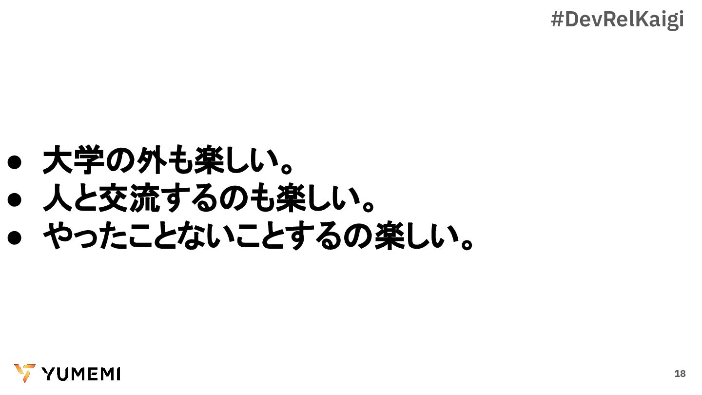 #DevRelKaigi • 大学の外も楽しい。 • 人と交流するのも楽しい。 • やったことないことするの楽しい。