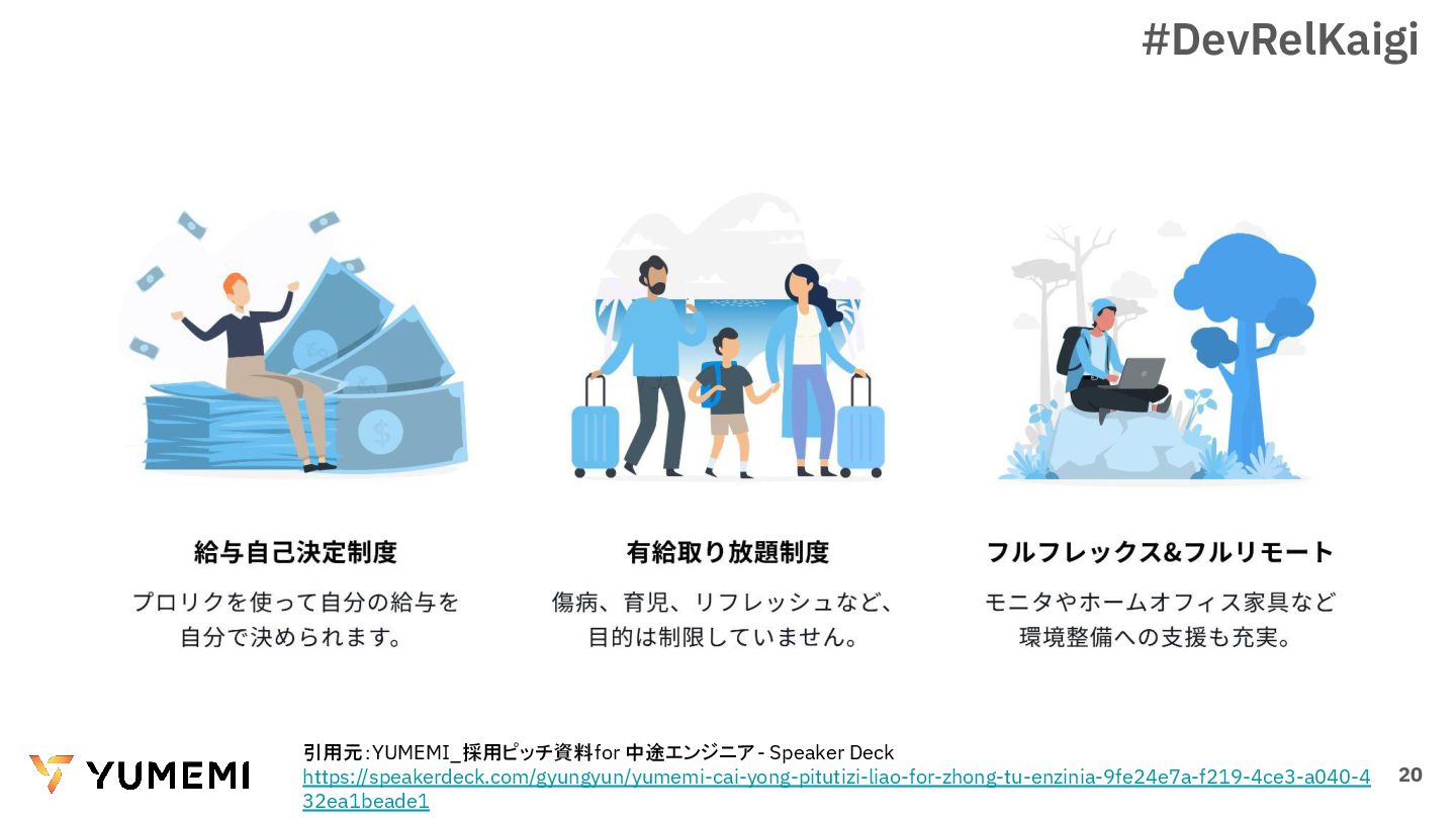 #DevRelKaigi 20 引用元:YUMEMI_採用ピッチ資料 for 中途エンジニア - Speaker Deck https://speakerdeck.com/gyungyun/yumemi-cai-yong-pitutizi-liao-for-zhong-tu-enzinia-9fe24e7a-f219-4ce3-a040-4 32ea1beade1