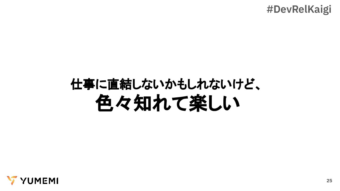 #DevRelKaigi 仕事に直結しないかもしれないけど、 色々知れて楽しい 25