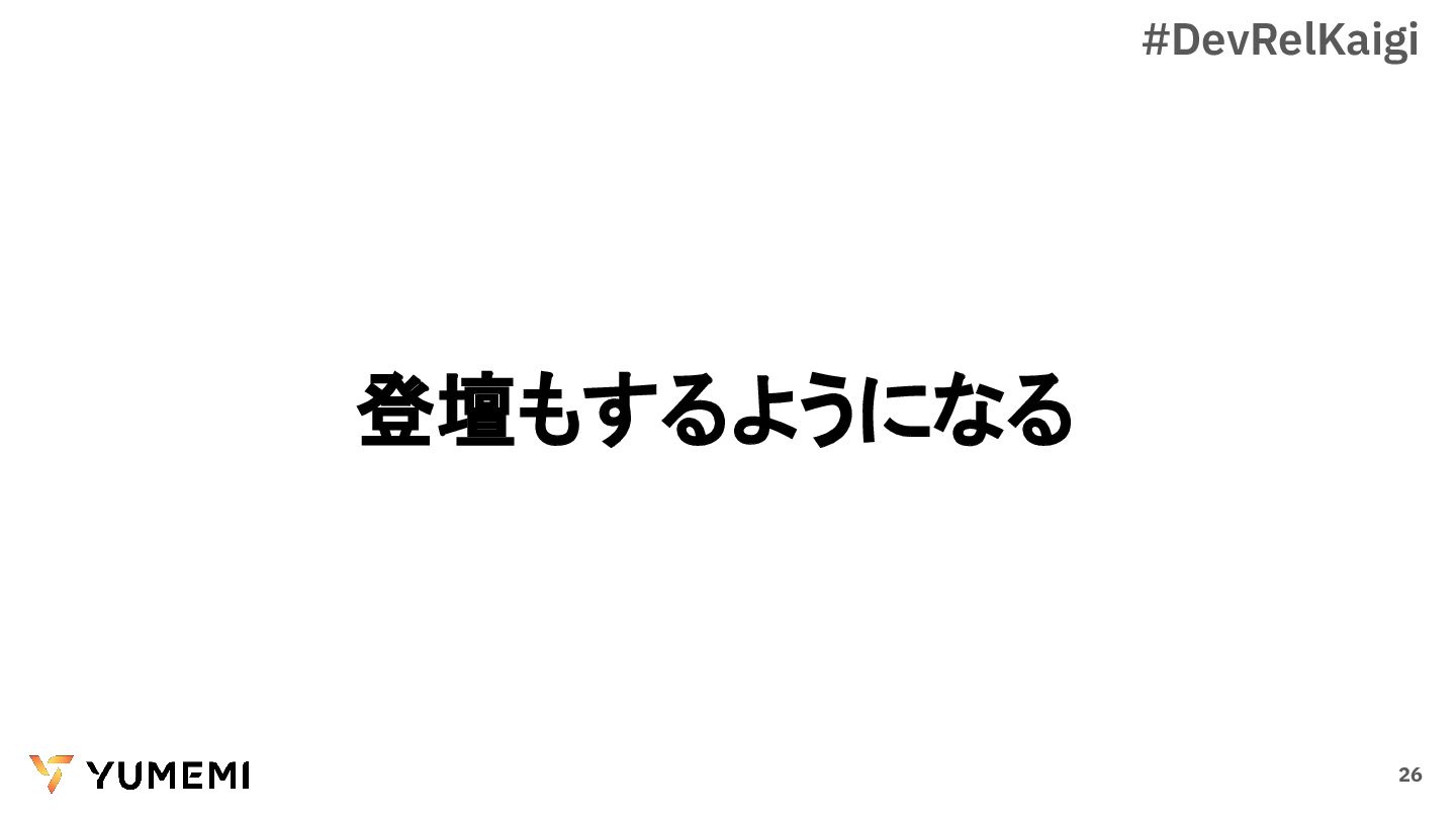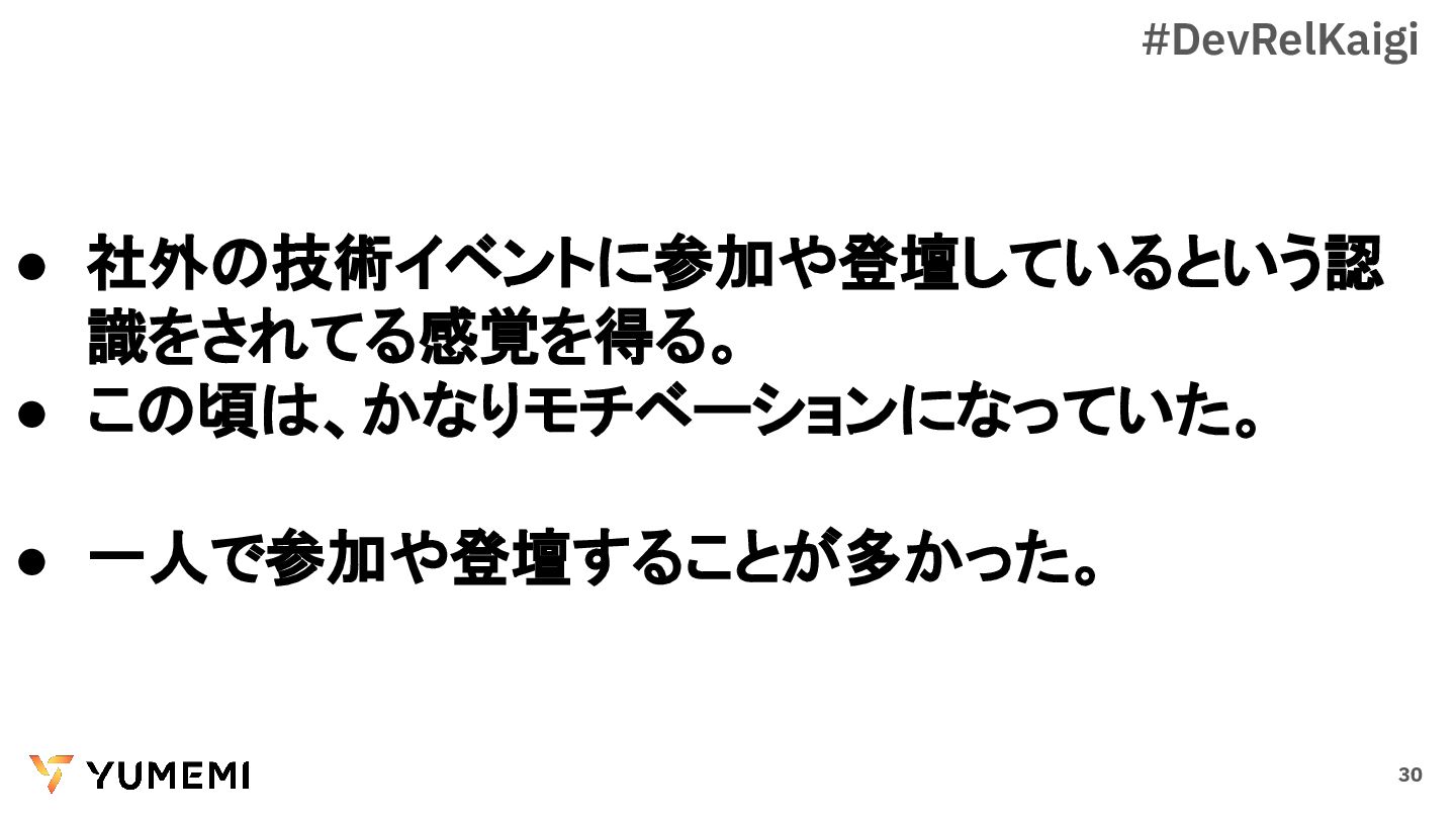 #DevRelKaigi • 社外の技術イベントに参加や登壇しているという認 識をされてる感覚を得る。 • この頃は、かなりモチベーションになっていた。 •