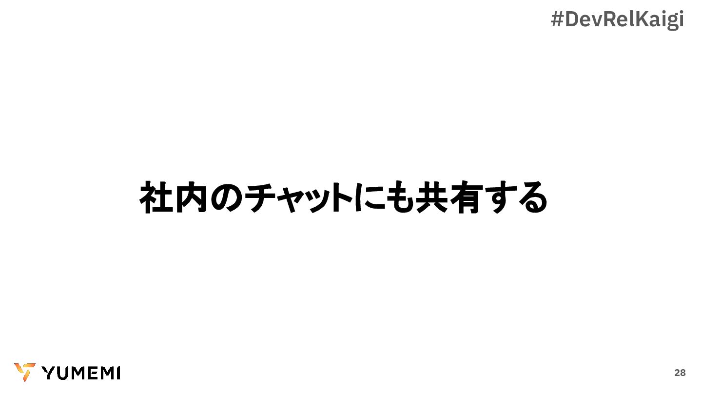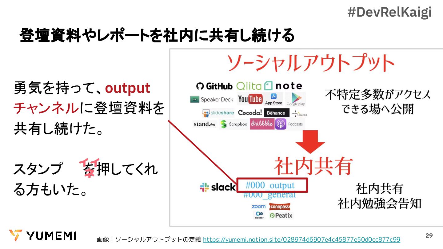 #DevRelKaigi 登壇資料やレポートを社内に共有し続ける 勇気を持って、output チャンネルに登壇資料を 共有し続けた。 スタンプ を押してくれ る方もいた。 29