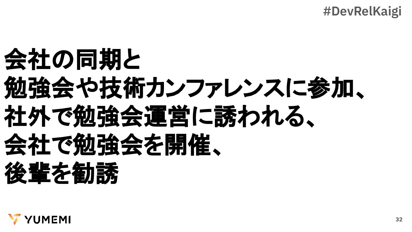 #DevRelKaigi 会社の同期と 勉強会や技術カンファレンスに参加、 社外で勉強会運営に誘われる、 会社で勉強会を開催、 後輩を勧誘
