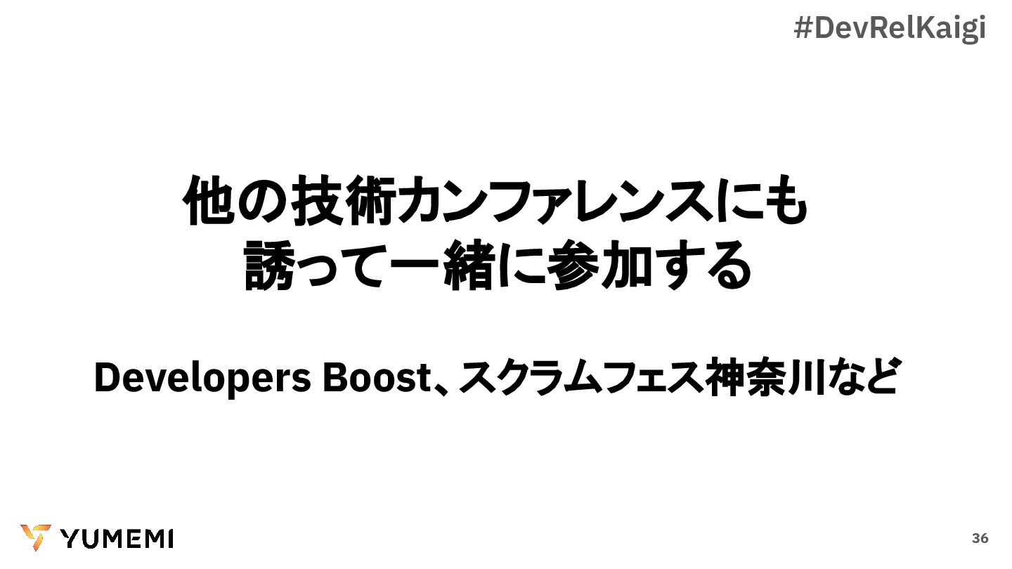 #DevRelKaigi 他の技術カンファレンスにも 誘って一緒に参加する Developers Boost、スクラムフェス神奈川など 36