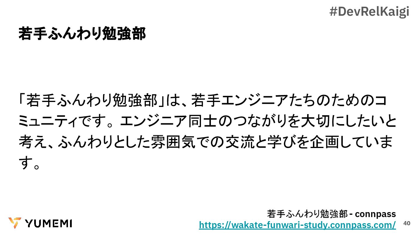 #DevRelKaigi 若手ふんわり勉強部 「若手ふんわり勉強部」は、若手エンジニアたちのためのコ ミュニティです。 エンジニア同士のつながりを大切にしたいと 考え、ふんわりとした雰囲気での交流と学びを企画していま す。 40 若手ふんわり勉強部