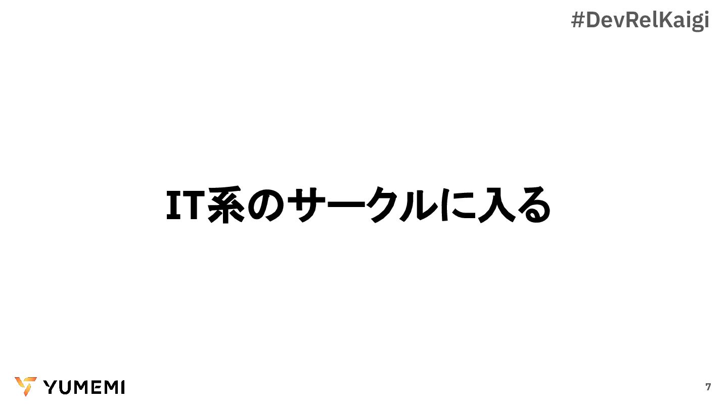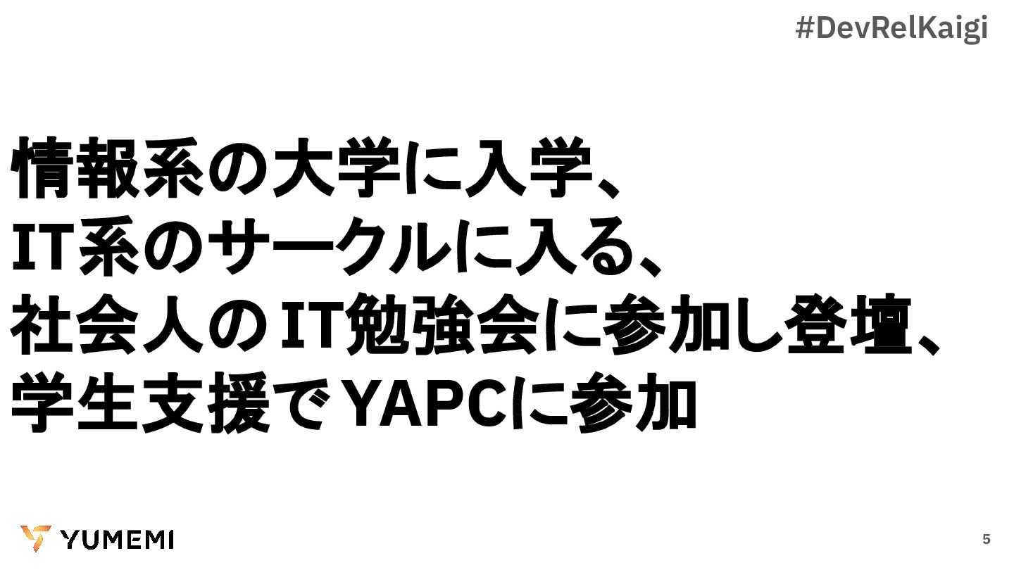 #DevRelKaigi 情報系の大学に入学、 IT系のサークルに入る、 社会人のIT勉強会に参加し登壇、 学生支援で YAPCに参加 5