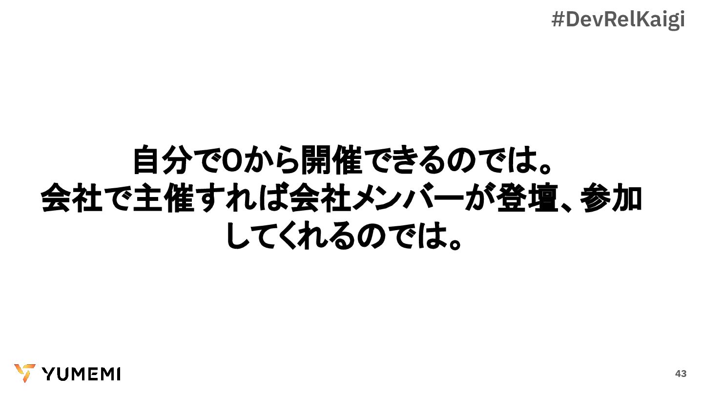#DevRelKaigi 自分で0から開催できるのでは。 会社で主催すれば会社メンバーが登壇、参加 してくれるのでは。 43