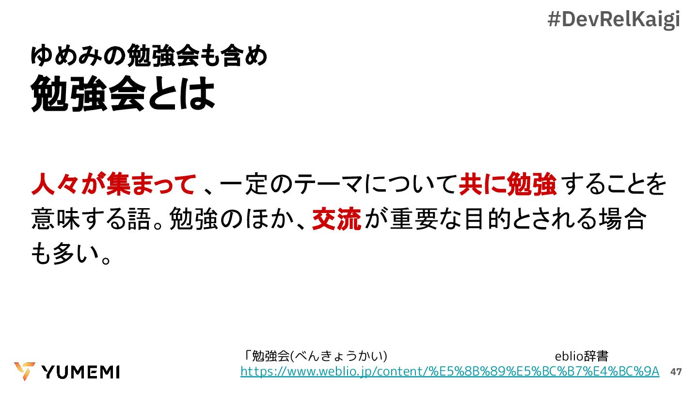 #DevRelKaigi ゆめみの勉強会も含め 勉強会とは 人々が集まって 、一定のテーマについて共に勉強することを 意味する語。勉強のほか、交流が重要な目的とされる場合 も多い。 47