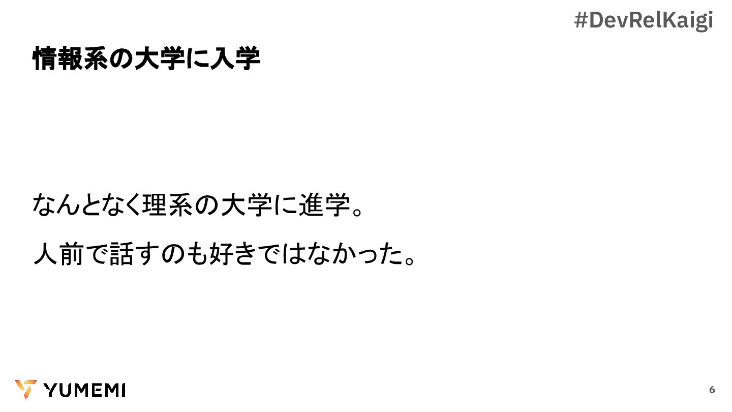 #DevRelKaigi 情報系の大学に入学 なんとなく理系の大学に進学。 人前で話すのも好きではなかった。 6