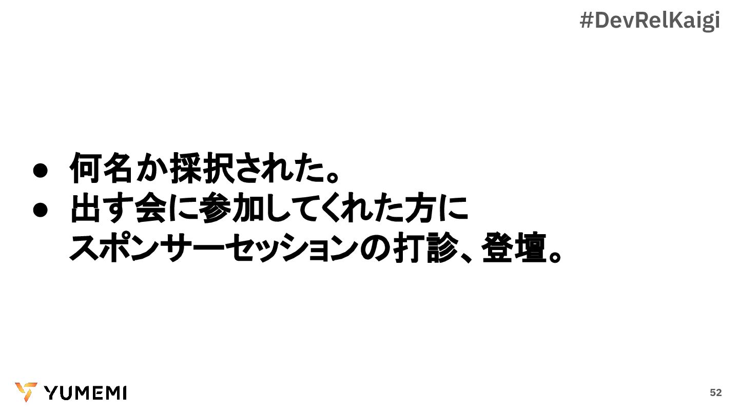 #DevRelKaigi • 何名か採択された。 • 出す会に参加してくれた方に スポンサーセッションの打診、登壇。 52