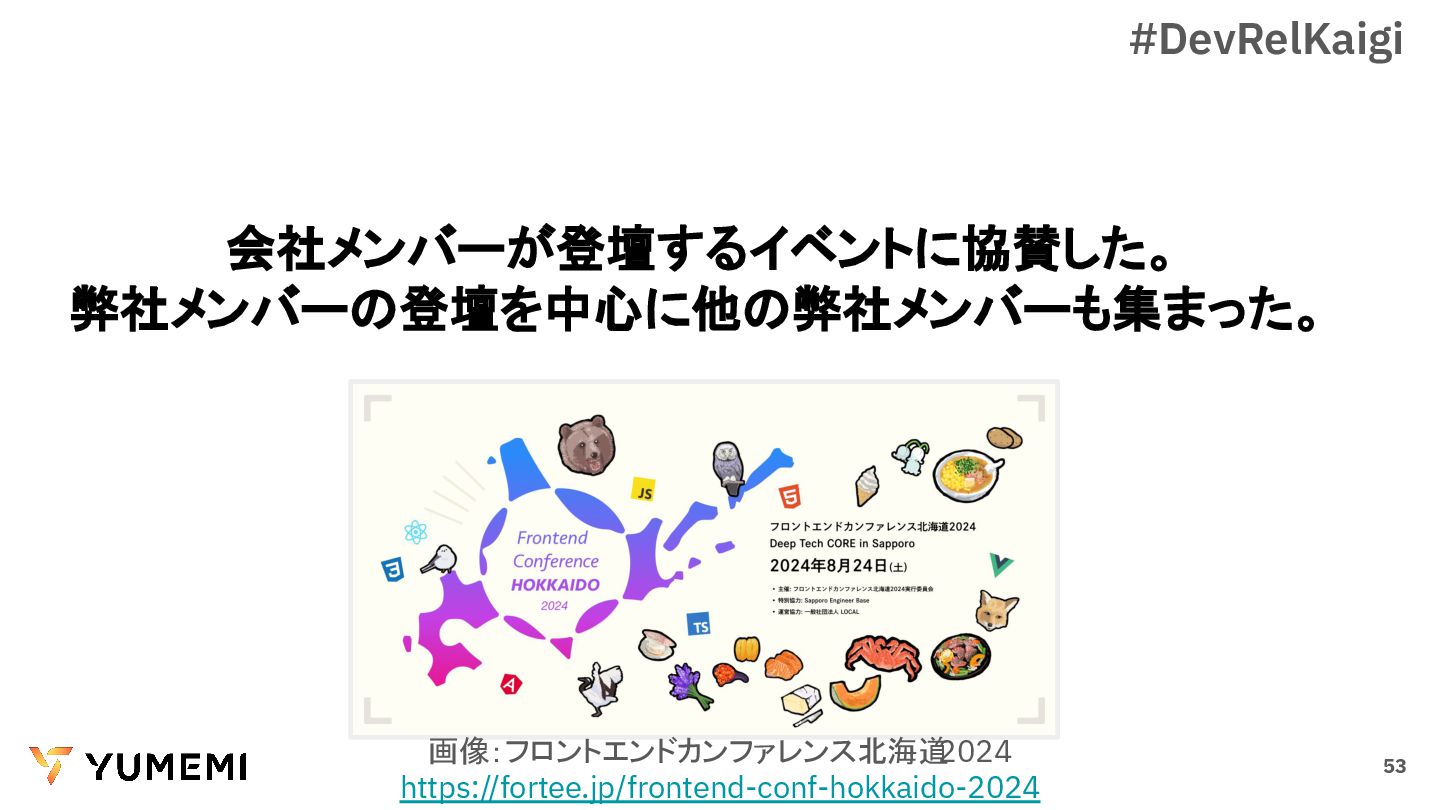 #DevRelKaigi 画像:フロントエンドカンファレンス北海道 2024 https://fortee.jp/frontend-conf-hokkaido-2024 53 会社メンバーが登壇するイベントに協賛した。 弊社メンバーの登壇を中心に他の弊社メンバーも集まった。