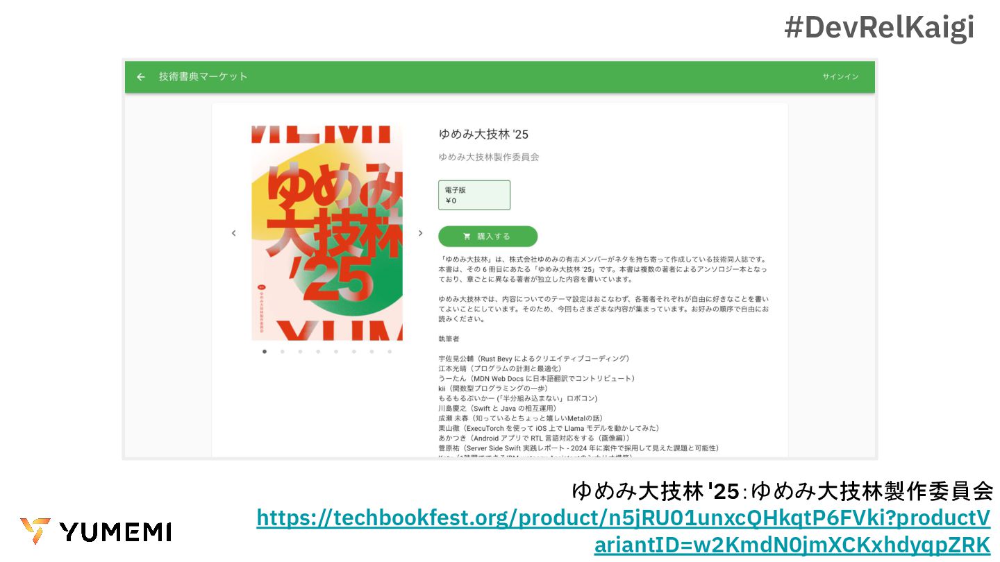 #DevRelKaigi 56 ゆめみ大技林 '25:ゆめみ大技林製作委員会 https://techbookfest.org/product/n5jRU01unxcQHkqtP6FVki?productV ariantID=w2KmdN0jmXCKxhdyqpZRK