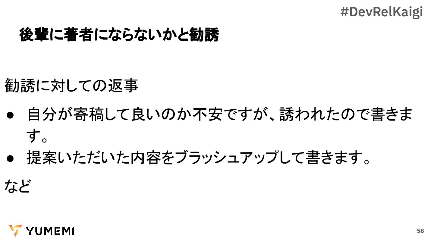 #DevRelKaigi 後輩に著者にならないかと勧誘 勧誘に対しての返事 • 自分が寄稿して良いのか不安ですが、誘われたので書きま す。 • 提案いただいた内容をブラッシュアップして書きます。