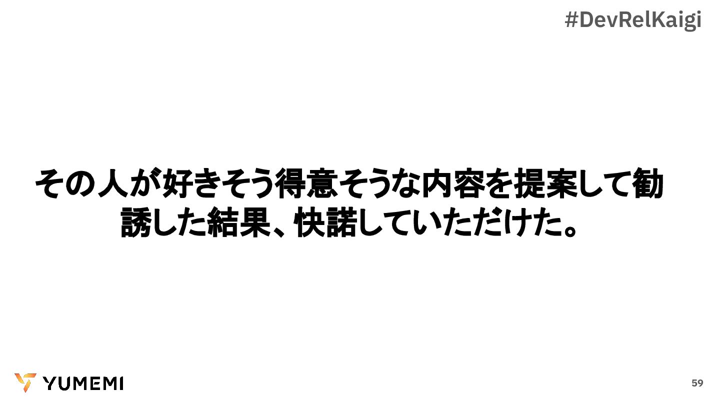 #DevRelKaigi その人が好きそう得意そうな内容を提案して勧 誘した結果、快諾していただけた。 59