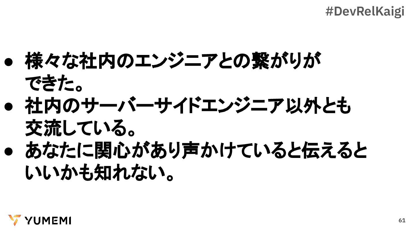 #DevRelKaigi • 様々な社内のエンジニアとの繋がりが できた。 • 社内のサーバーサイドエンジニア以外とも 交流している。