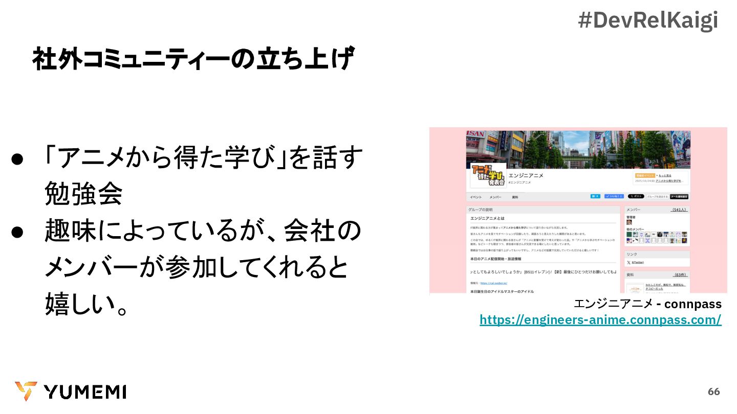 #DevRelKaigi 社外コミュニティーの立ち上げ • 「アニメから得た学び」を話す 勉強会 • 趣味によっているが、会社の メンバーが参加してくれると 嬉しい。