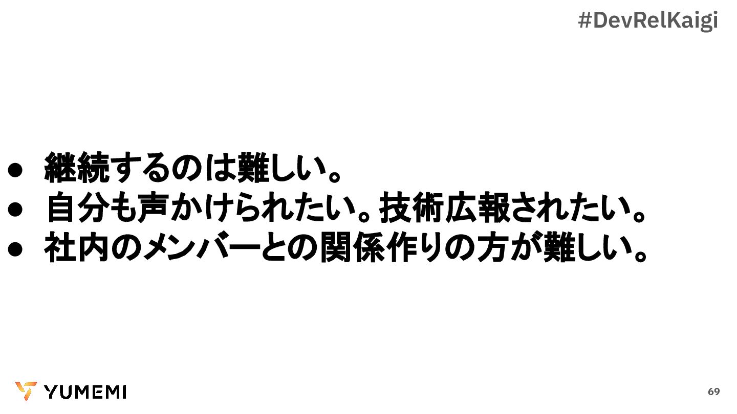 #DevRelKaigi • 継続するのは難しい。 • 自分も声かけられたい。技術広報されたい。 • 社内のメンバーとの関係作りの方が難しい。