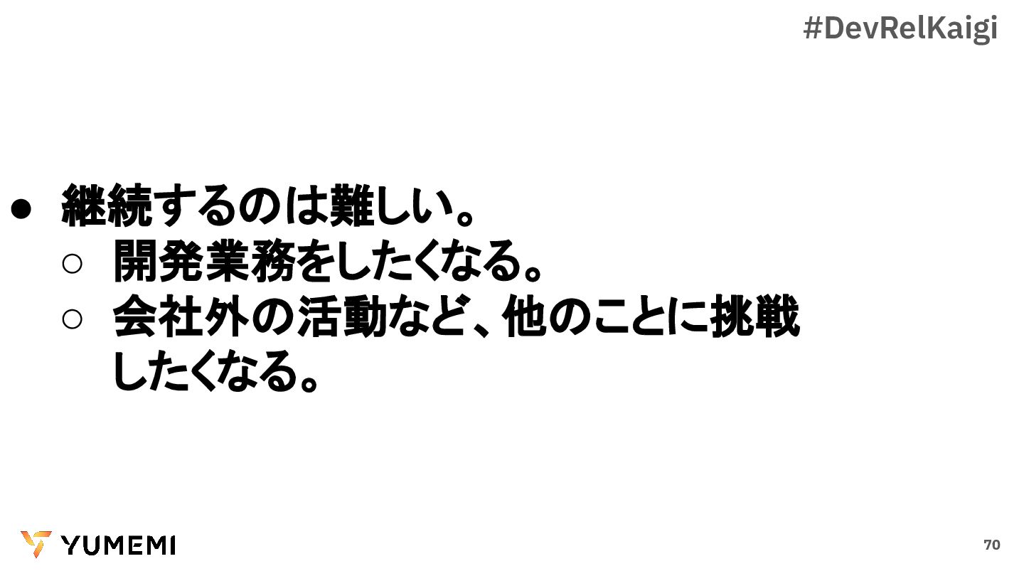 #DevRelKaigi • 継続するのは難しい。 ◦ 開発業務をしたくなる。 ◦ 会社外の活動など、他のことに挑戦