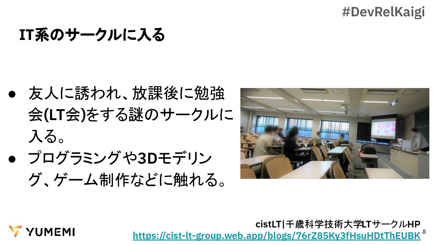 #DevRelKaigi IT系のサークルに入る • 友人に誘われ、放課後に勉強 会(LT会)をする謎のサークルに 入る。 • プログラミングや3Dモデリン グ、ゲーム制作などに触れる。