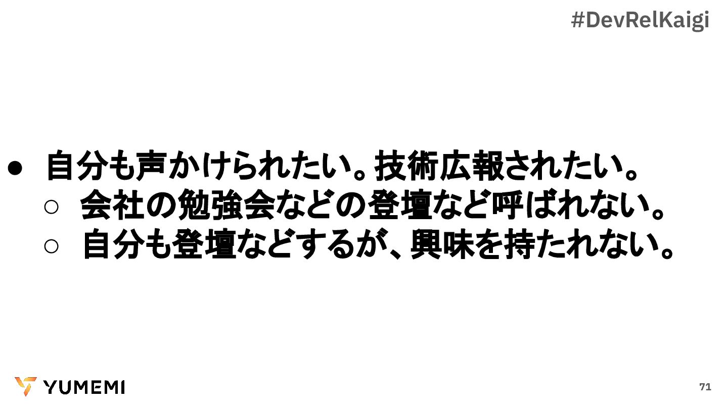 #DevRelKaigi • 自分も声かけられたい。技術広報されたい。 ◦ 会社の勉強会などの登壇など呼ばれない。 ◦ 自分も登壇などするが、興味を持たれない。