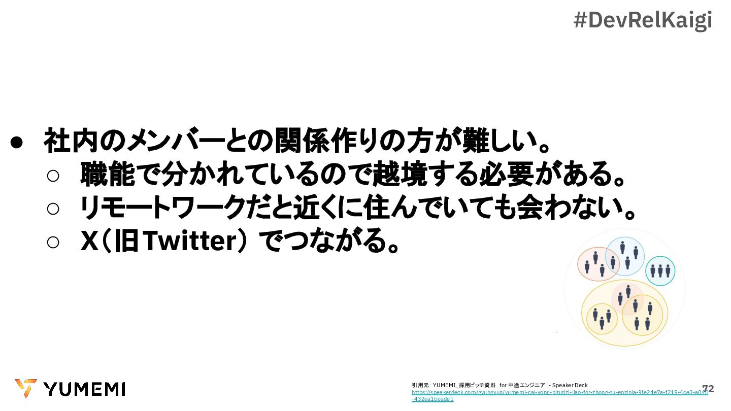 ◦ X(旧Twitter) でつながる。 72 引用元: YUMEMI_採用ピッチ資料 for 中途エンジニア - Speaker Deck https://speakerdeck.com/gyungyun/yumemi-cai-yong-pitutizi-liao-for-zhong-tu-enzinia-9fe24e7a-f219-4ce3-a040 -432ea1beade1