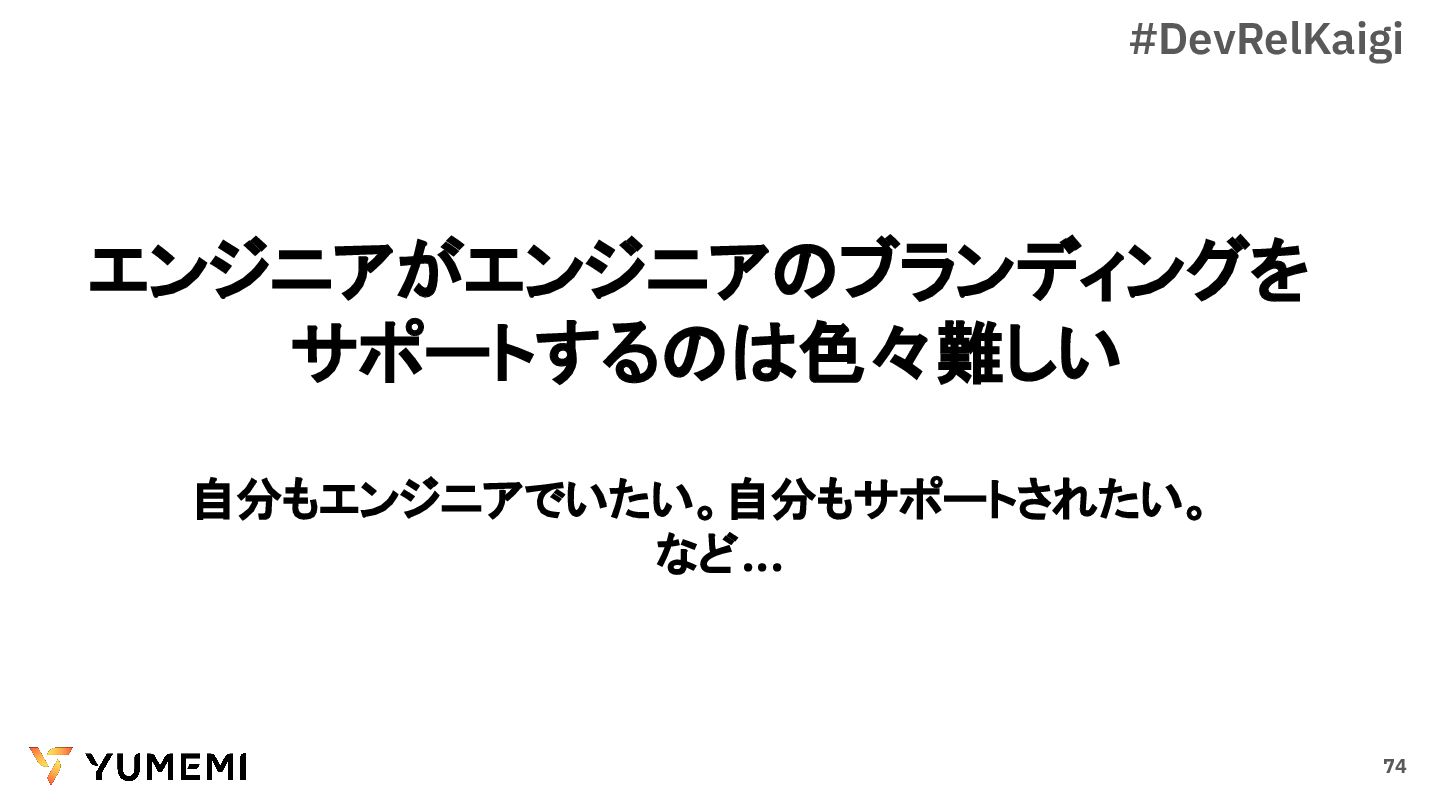 #DevRelKaigi エンジニアがエンジニアのブランディングを サポートするのは色々難しい 自分もエンジニアでいたい。自分もサポートされたい。 など... 74