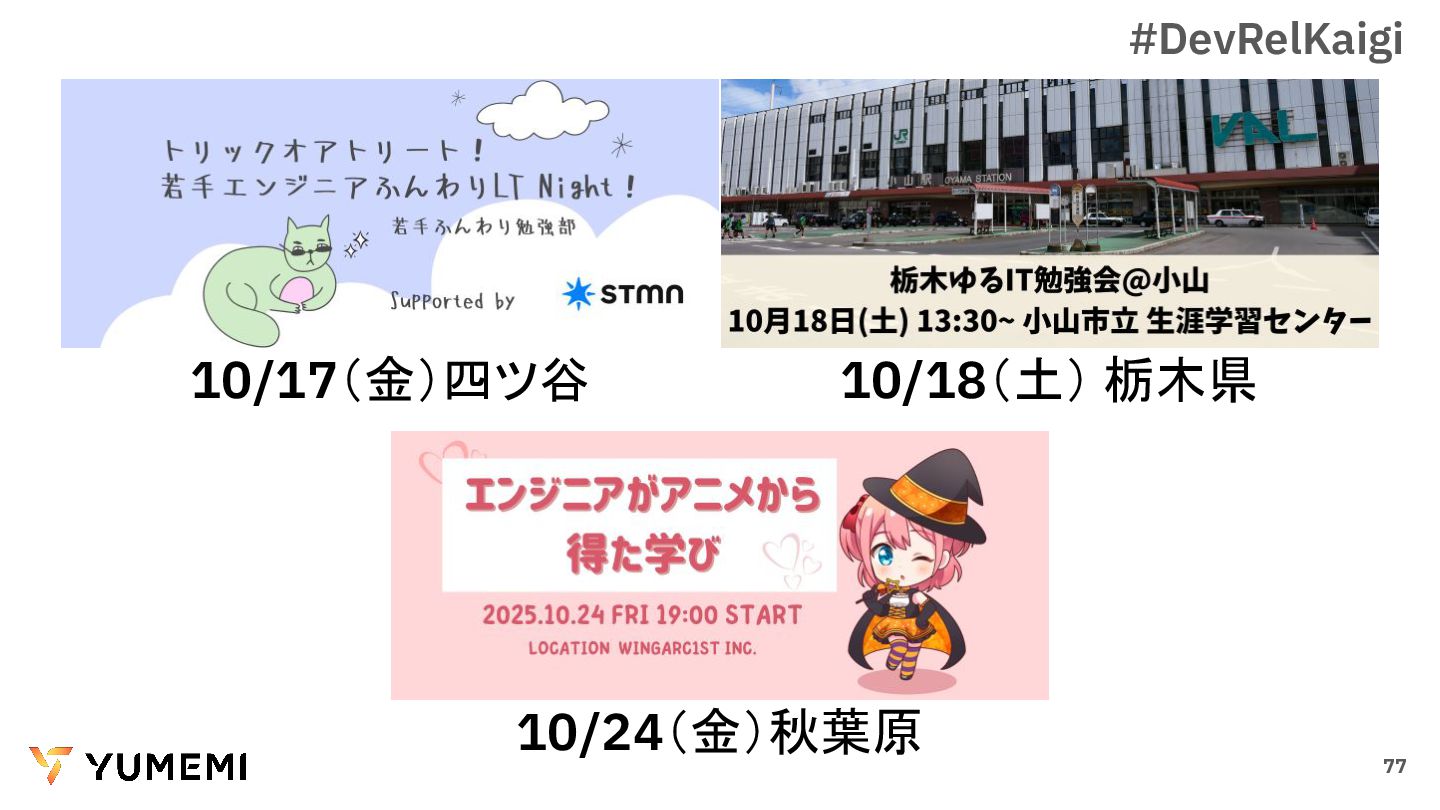 #DevRelKaigi 77 10/24(金)秋葉原 10/18(土) 栃木県 10/17(金)四ツ谷