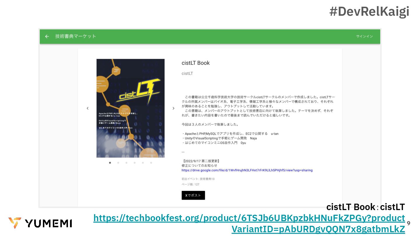 #DevRelKaigi 9 cistLT Book:cistLT https://techbookfest.org/product/6TSJb6UBKpzbkHNuFkZPGy?product VariantID=pAbURDgvQQN7x8gatbmLkZ