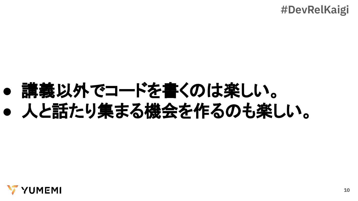 #DevRelKaigi • 講義以外でコードを書くのは楽しい。 • 人と話たり集まる機会を作るのも楽しい。 10
