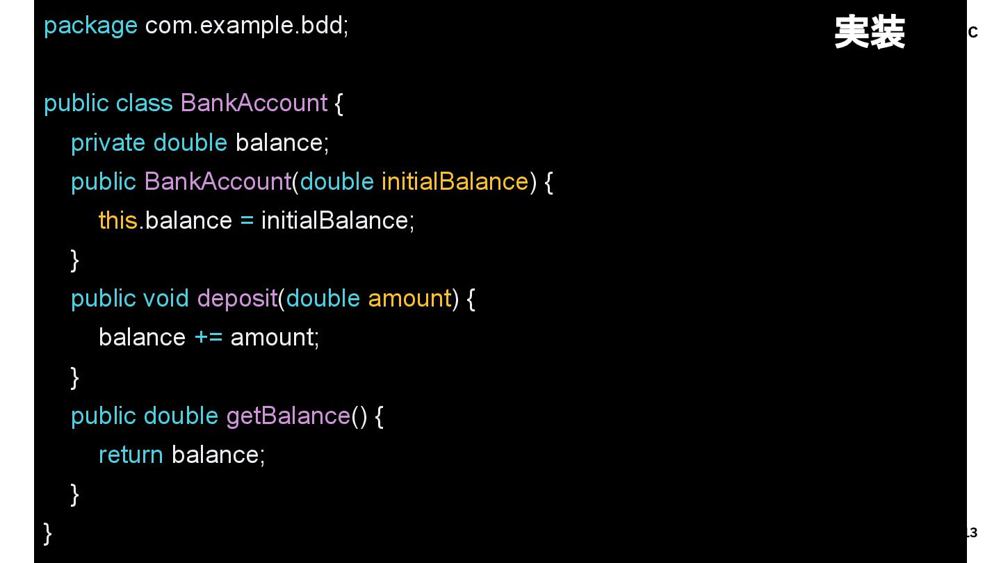 public class BankAccountSteps { private BankAccount account; @Given("初期残高が