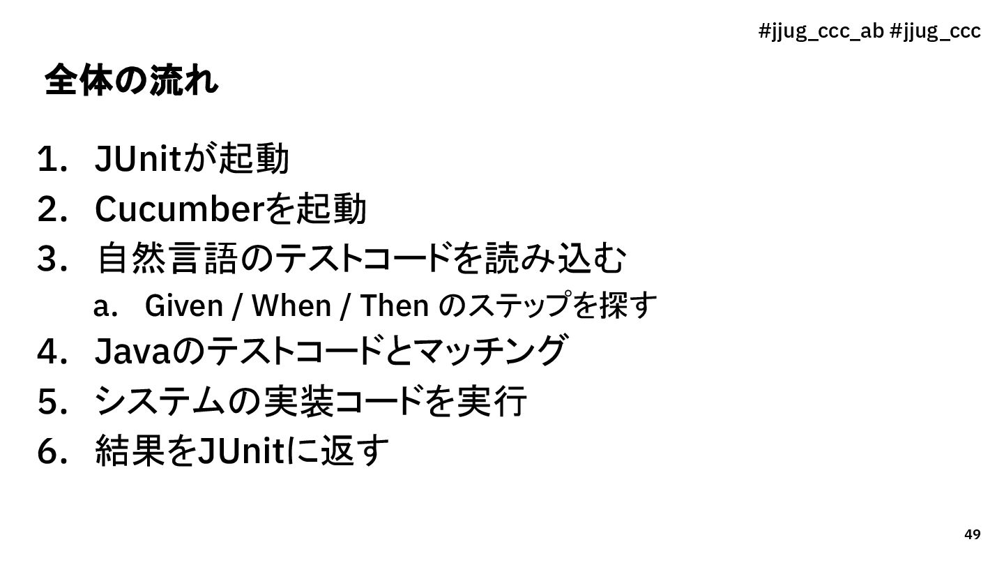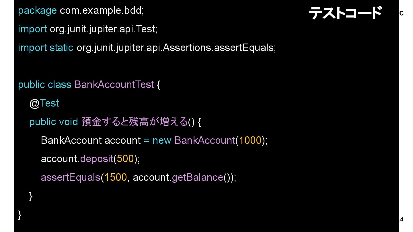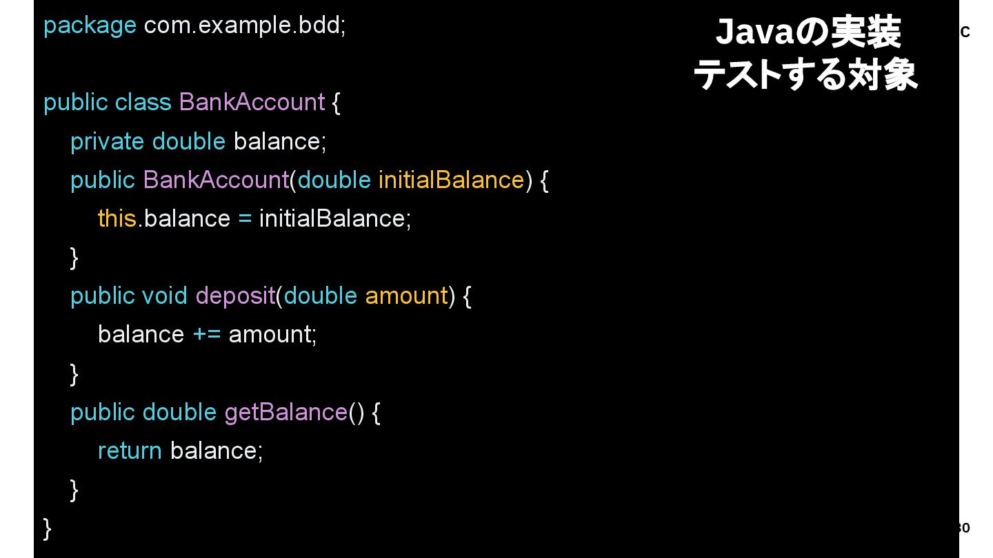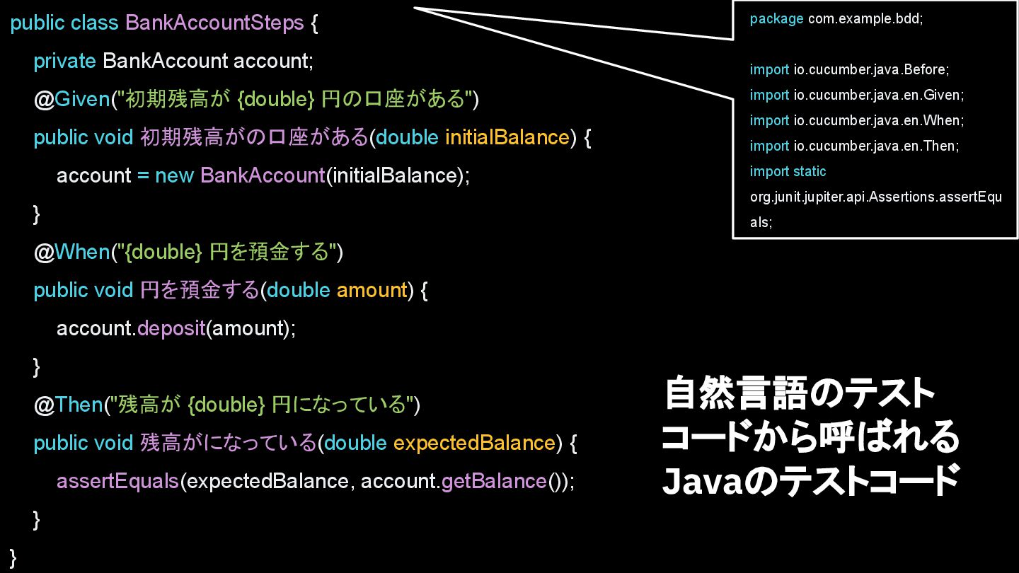 {double} 円の口座がある") public void 初期残高がの口座がある(double initialBalance) { account = new BankAccount(initialBalance); } @When("{double} 円を預金する") public void 円を預金する(double amount) { account.deposit(amount); } @Then("残高が {double} 円になっている") public void 残高がになっている(double expectedBalance) { assertEquals(expectedBalance, account.getBalance()); } } package com.example.bdd; import io.cucumber.java.Before; import io.cucumber.java.en.Given; import io.cucumber.java.en.When; import io.cucumber.java.en.Then; import static org.junit.jupiter.api.Assertions.assertEqu als; 自然言語のテスト コードから呼ばれる