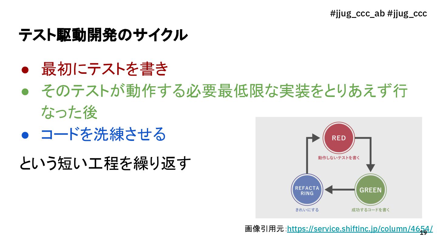 テスト駆動開発 とは、プログラム開発手法の一種で、プログラム に必要な各機能について、最初にテストを書き(これをテスト ファーストと言う)、そのテストが動作する必要最低限な実装を とりあえず行なった後、コードを洗練させる 、という短い工程を繰