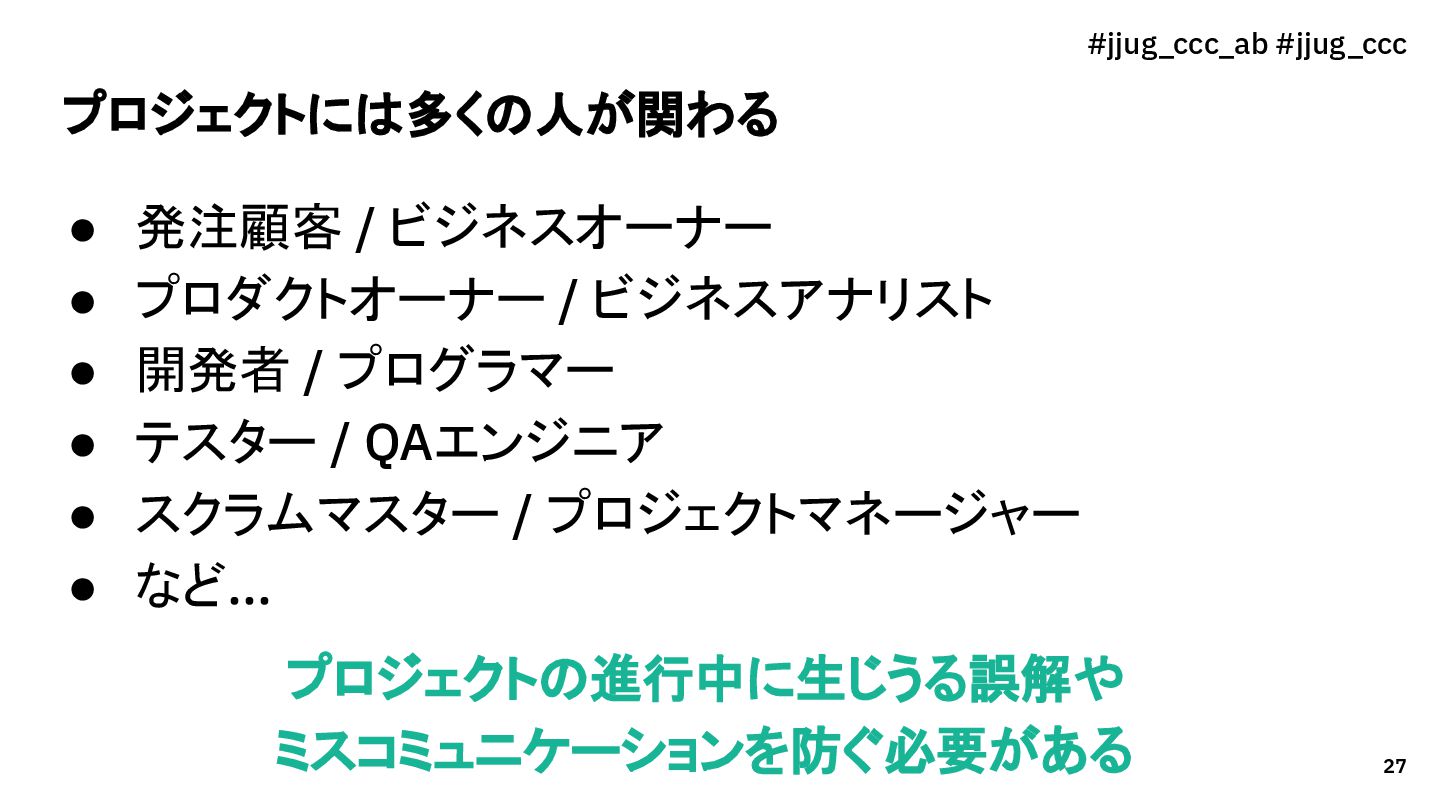 • 顧客、ユーザー、ビジネスアナリストなど、開発チーム内の プログラミングに携わらないメンバーとの