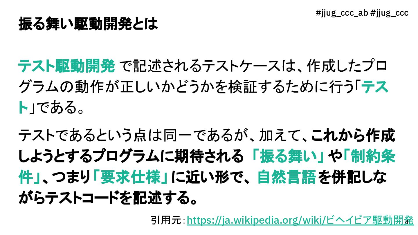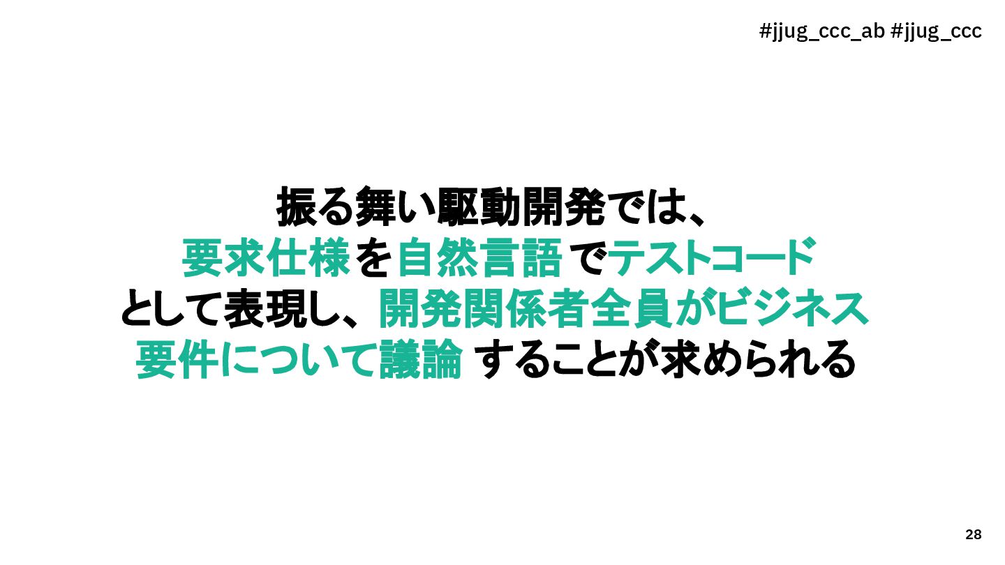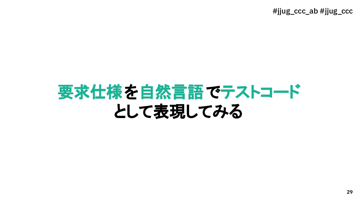 「振る舞い」 や「制約条 件」、つまり「要求仕様」 に近い形で、 自然言語を併記しな がらテストコードを記述する。