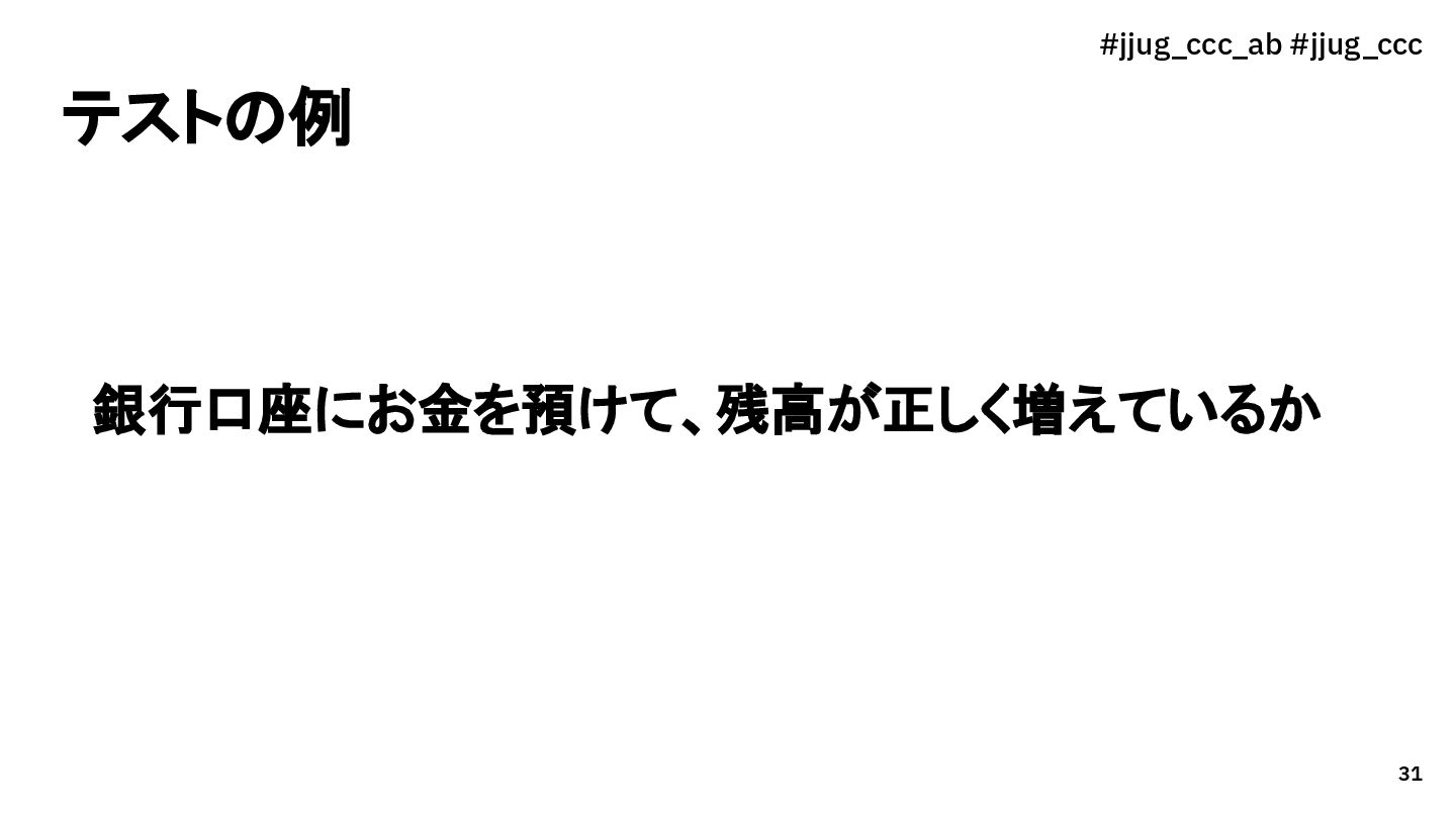 class BankAccountTest { @Test public void 預金すると残高が増える() { BankAccount account = new BankAccount(1000); account.deposit(500); assertEquals(1500, account.getBalance()); } } テストコード