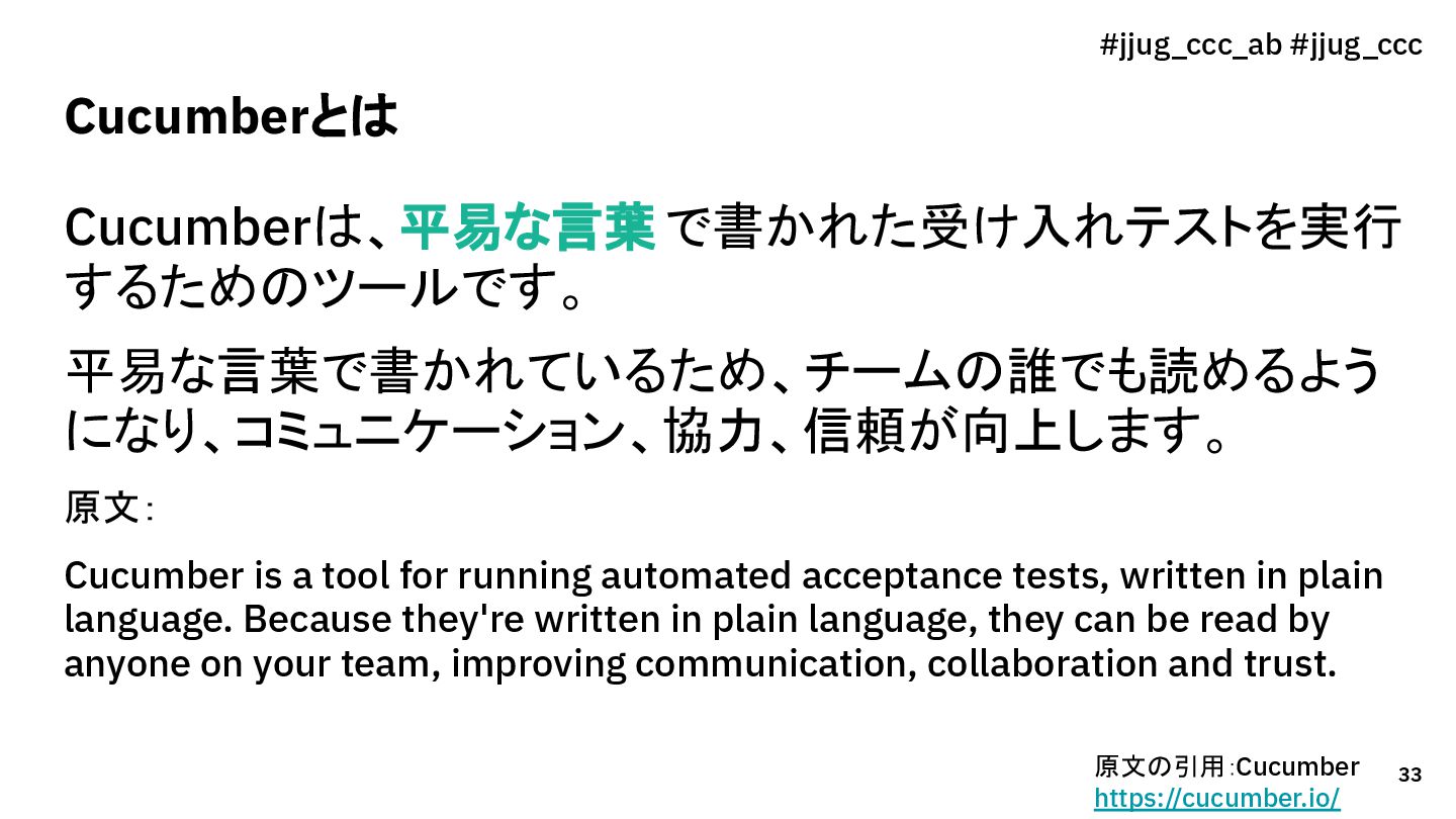 Cucumberは、平易な言葉 で書かれた受け入れテストを実行 するためのツールです。