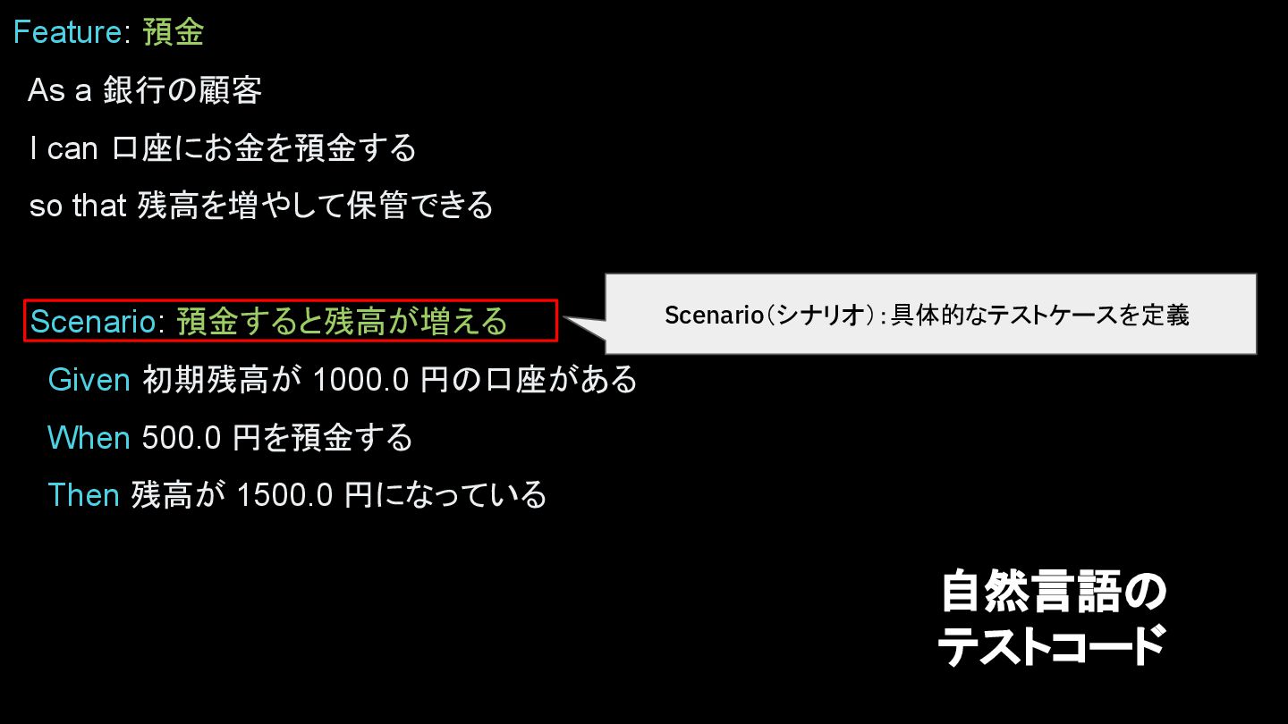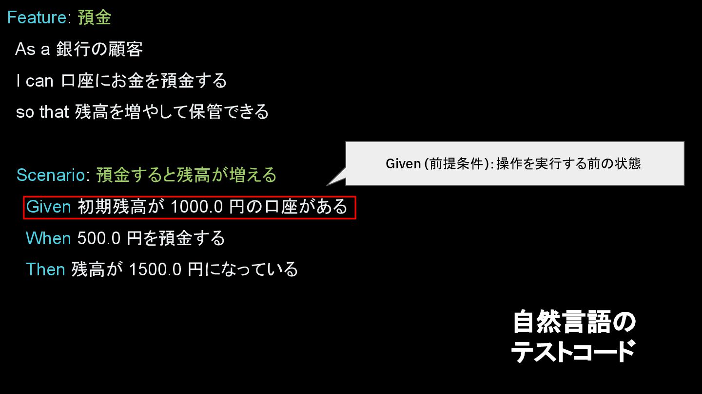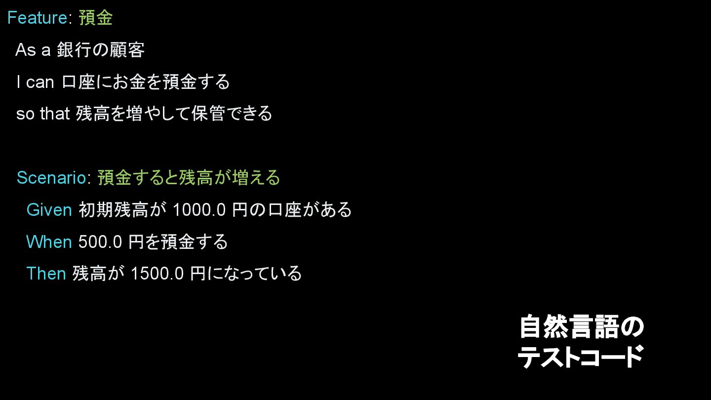 so that 残高を増やして保管できる Scenario: 預金すると残高が増える Given 初期残高が 1000.0 円の口座がある When 500.0 円を預金する Then 残高が 1500.0 円になっている 自然言語の
