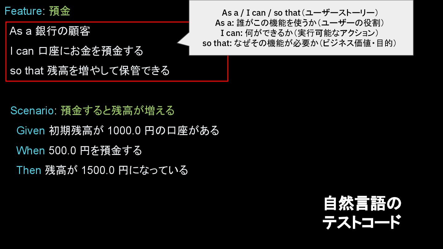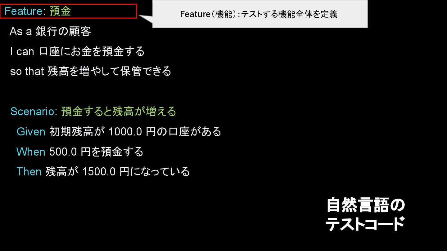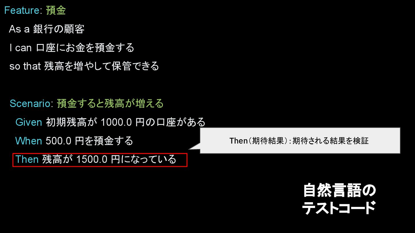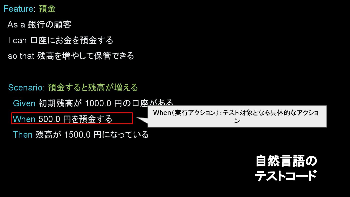 so that 残高を増やして保管できる Scenario: 預金すると残高が増える Given 初期残高が 1000.0 円の口座がある When 500.0 円を預金する Then 残高が 1500.0 円になっている 自然言語の