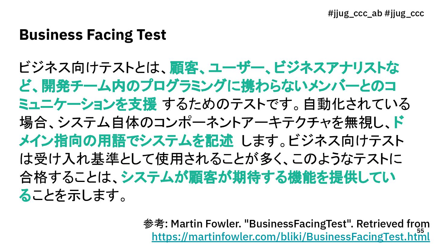 参考: Martin Fowler. "BusinessFacingTest". Retrieved from https://martinfowler.com/bliki/BusinessFacingTest.html