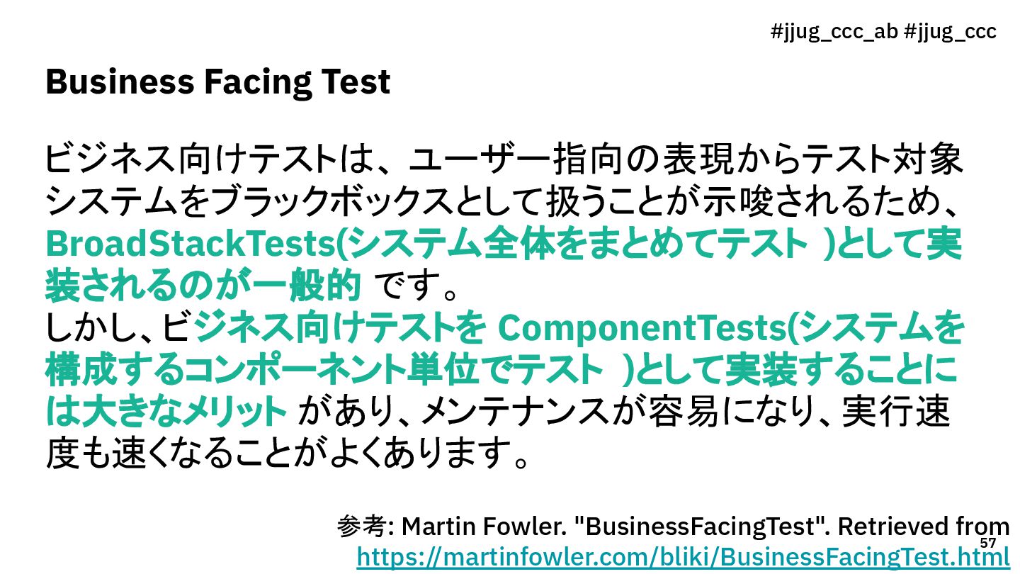 しかし、ビジネス向けテストを ComponentTests(システムを 構成するコンポーネント単位でテスト )として実装することに は大きなメリット があり、メンテナンスが容易になり、実行速 度も速くなることがよくあります。