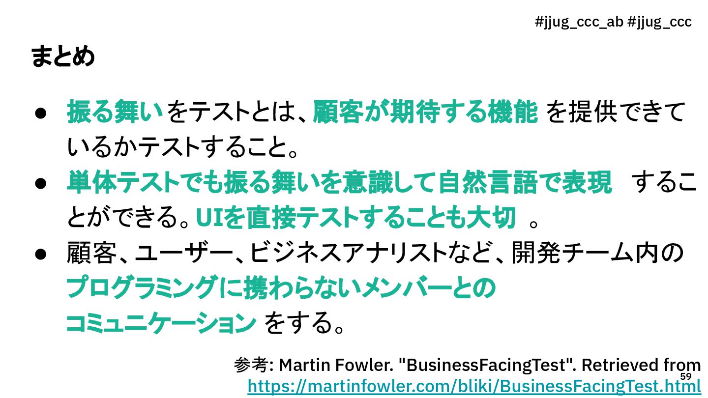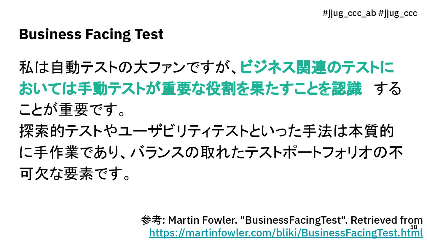 ビジネス向けテストとは、顧客、ユーザー、ビジネスアナリストな ど、開発チーム内のプログラミングに携わらないメンバーとのコ ミュニケーションを支援 するためのテストです。自動化されている 場合、システム自体のコンポーネントアーキテクチャを無視し、ド