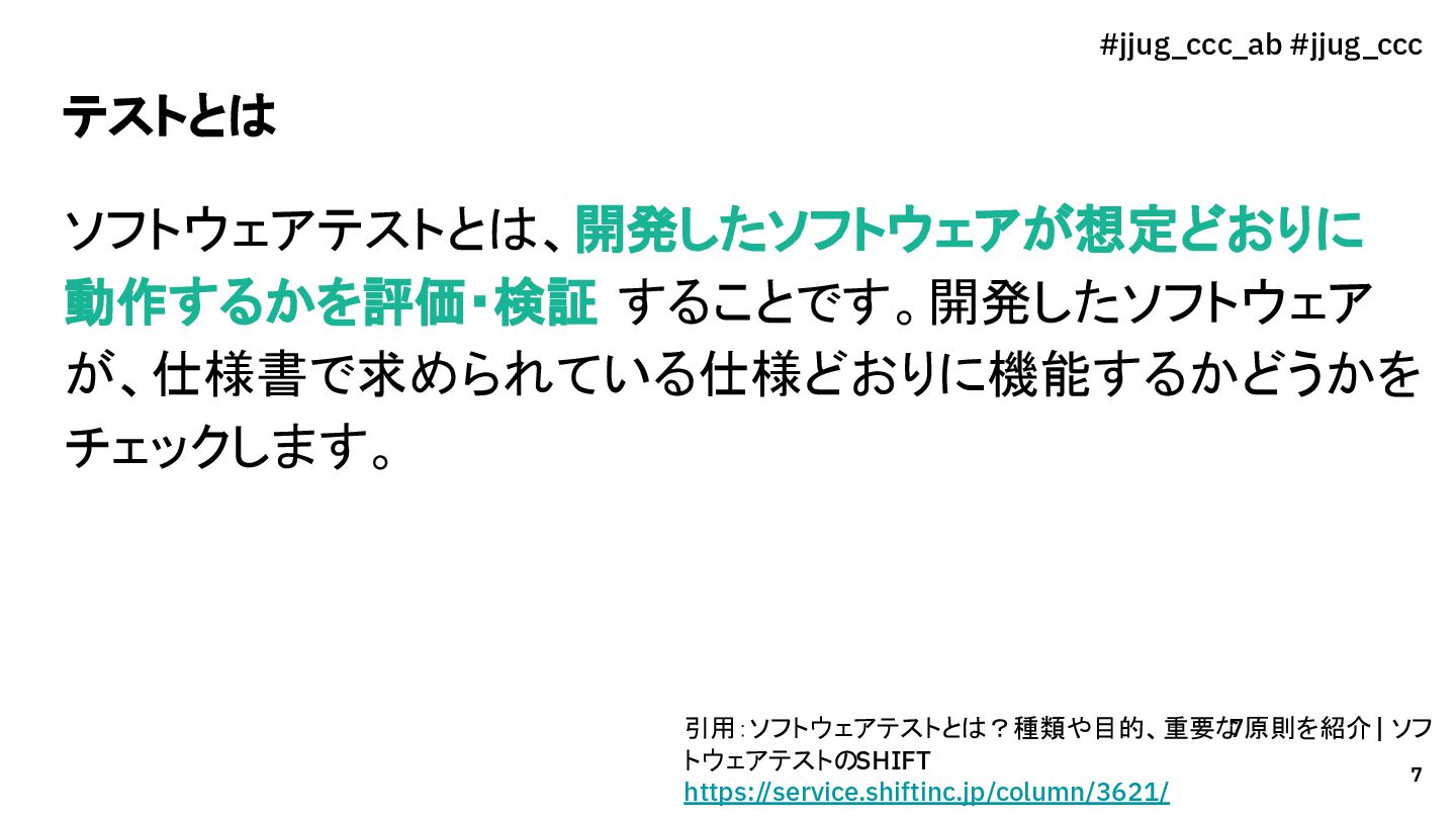 テスト駆動開発 で記述されるテストケースは、作成したプロ グラムの動作が正しいかどうかを検証するために行う「テス ト」である。